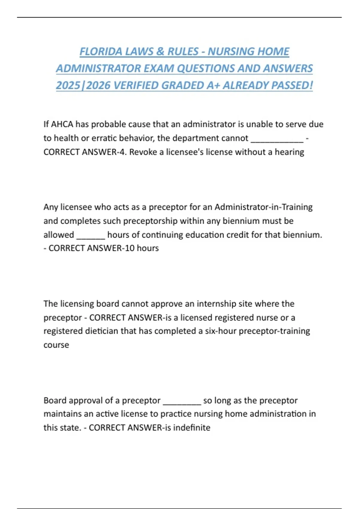 FLORIDA LAWS & RULES - NURSING HOME ADMINISTRATOR EXAM QUESTIONS AND ANSWERS 2025|2026 VERIFIED GRADED A+ ALREADY PASSED!