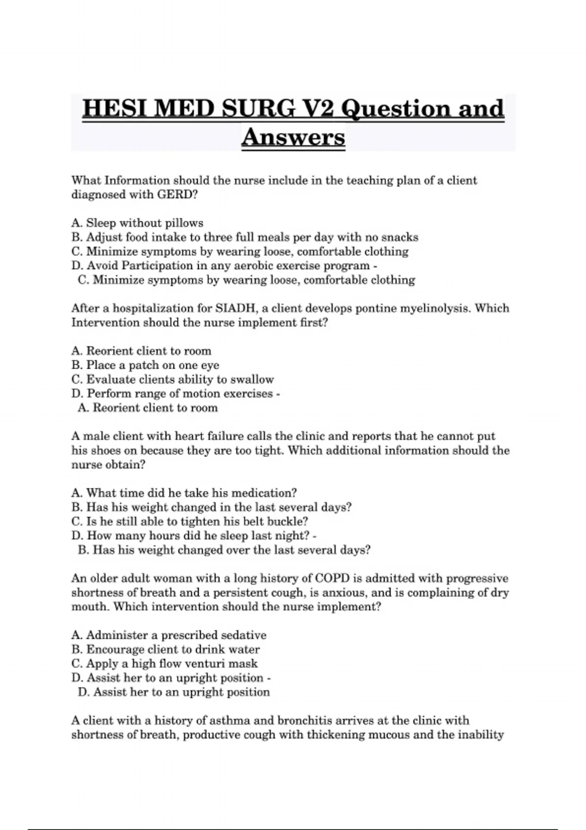 This document covers HESI Medical-Surgical (Med Surg) V2 exam questions with verified correct answers, focusing on core adult health concepts and clinical decision-making. It includes commonly tested conditions, nursing interventions, prioritization, and patient safety topics aligned with the HESI blueprint. The material is designed to support focused review and exam readiness.