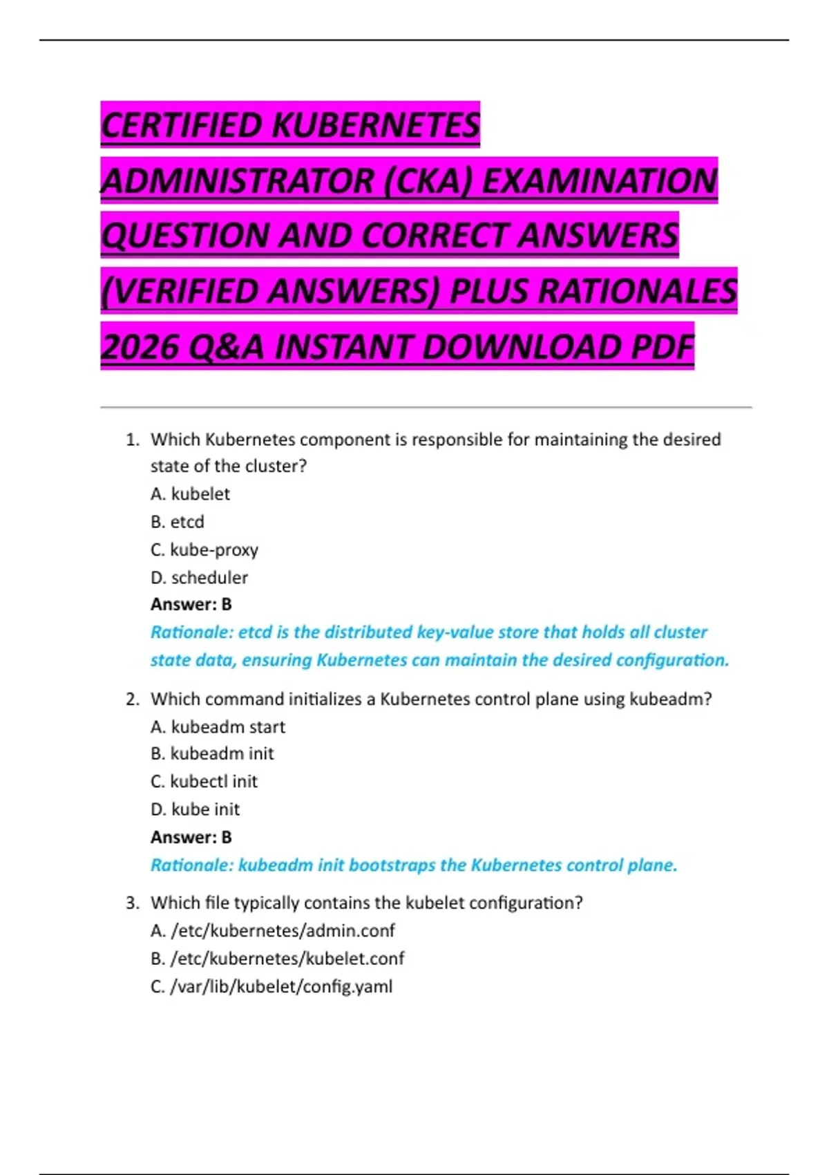 CERTIFIED KUBERNETES ADMINISTRATOR (CKA) EXAMINATION QUESTION AND CORRECT ANSWERS (VERIFIED ANSWERS) PLUS RATIONALES 2026 Q&A INSTANT DOWNLOAD PDF
