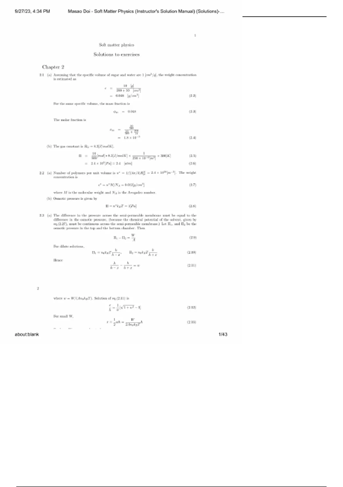INSTANT PDF DOWNLOAD — Complete Solutions Manual for Soft Matter Physics by Masao Doi (1st ed., 2014). Covers Chapters 2–10 with fully worked derivations and numerical solutions on polymers and colloids, Brownian motion & diffusion, viscoelasticity and rheology, rubber elasticity, scaling ideas, liquid crystals, gels & soft interfaces, self-assembly, micelles/surfactants, phase separation & spinodal decomposition, interfacial tension, and osmotic pressure. Searchable, printable PDF with step-by-step reasoning, diagrams, and equation walkthroughs—perfect for physics, materials science, chemical engineering, and biophysics exam prep. soft matter physics solutions, Doi soft matter solutions PDF, polymer physics problems, colloids solutions manual, liquid crystals exercises, gels rheology answers, viscoelasticity problems, Brownian motion diffusion, Stokes Einstein, polymer dynamics Rouse Zimm, scaling laws de Gennes, osmotic pressure solutions, surface tension interfacial phenomena, self-assembly thermodynamics, phase separation spinodal, DLVO colloid stability, micelles surfactants CMC, rubber elasticity entropy, rheology shear modulus, materials science graduate study guide