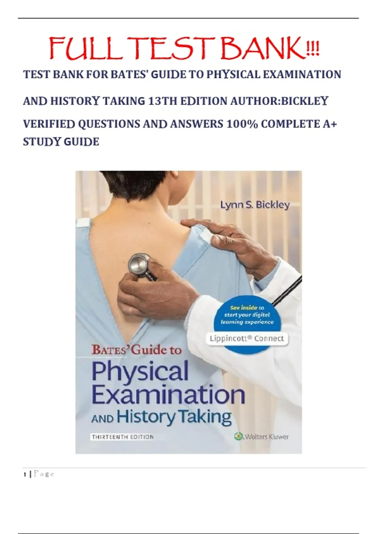 TEST BANK FOR BATES' GUIDE TO PHYSICAL EXAMINATION AND HISTORY TAKING 13TH EDITION AUTHOR:BICKLEY VERIFIED QUESTIONS AND ANSWERS 100% COMPLETE A+ STUDY GUIDE