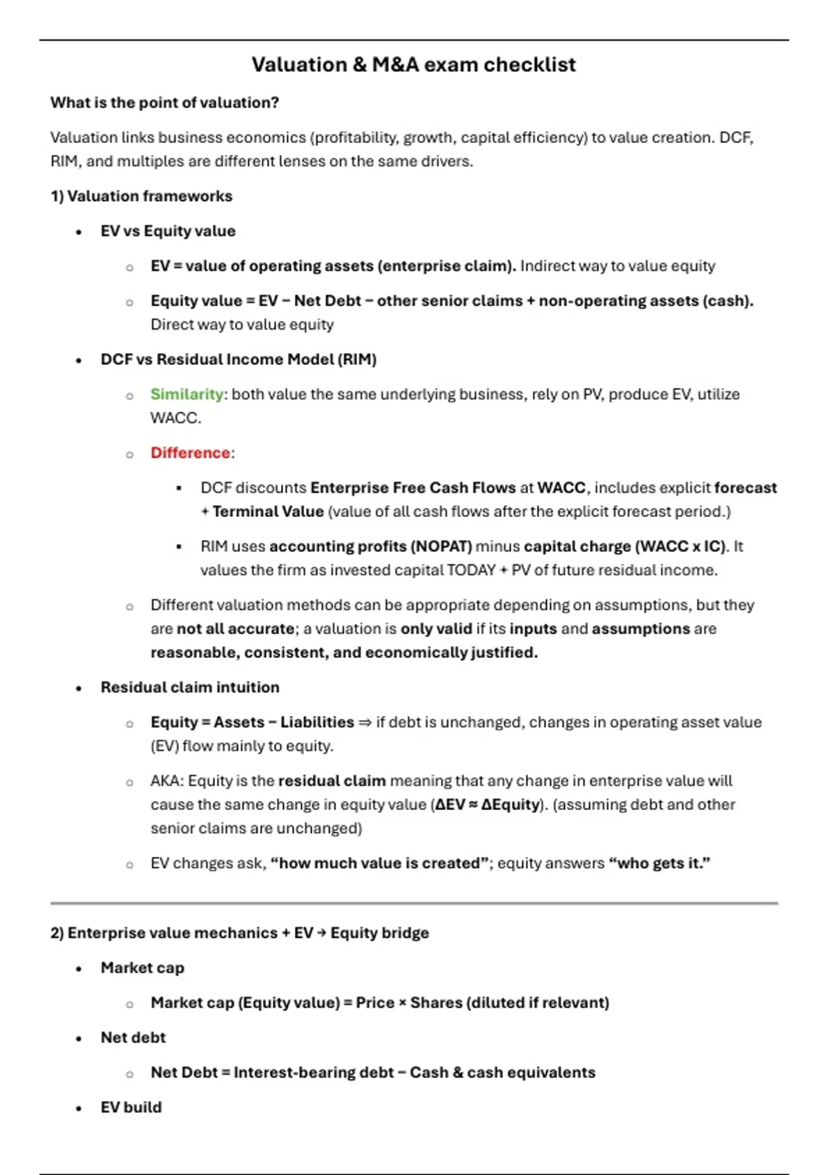 Valuation & M&A exam checklist