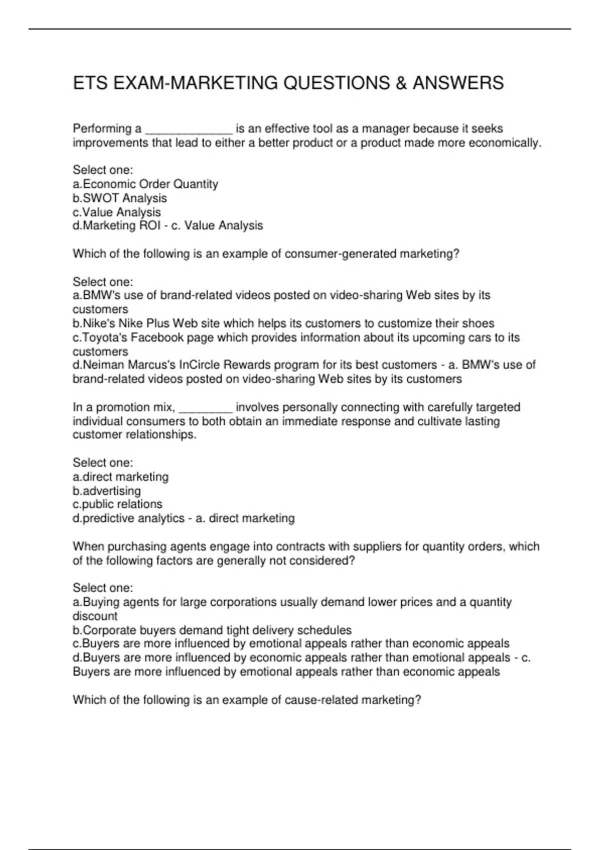 ETS EXAM-MARKETING QUESTIONS & ANSWERS