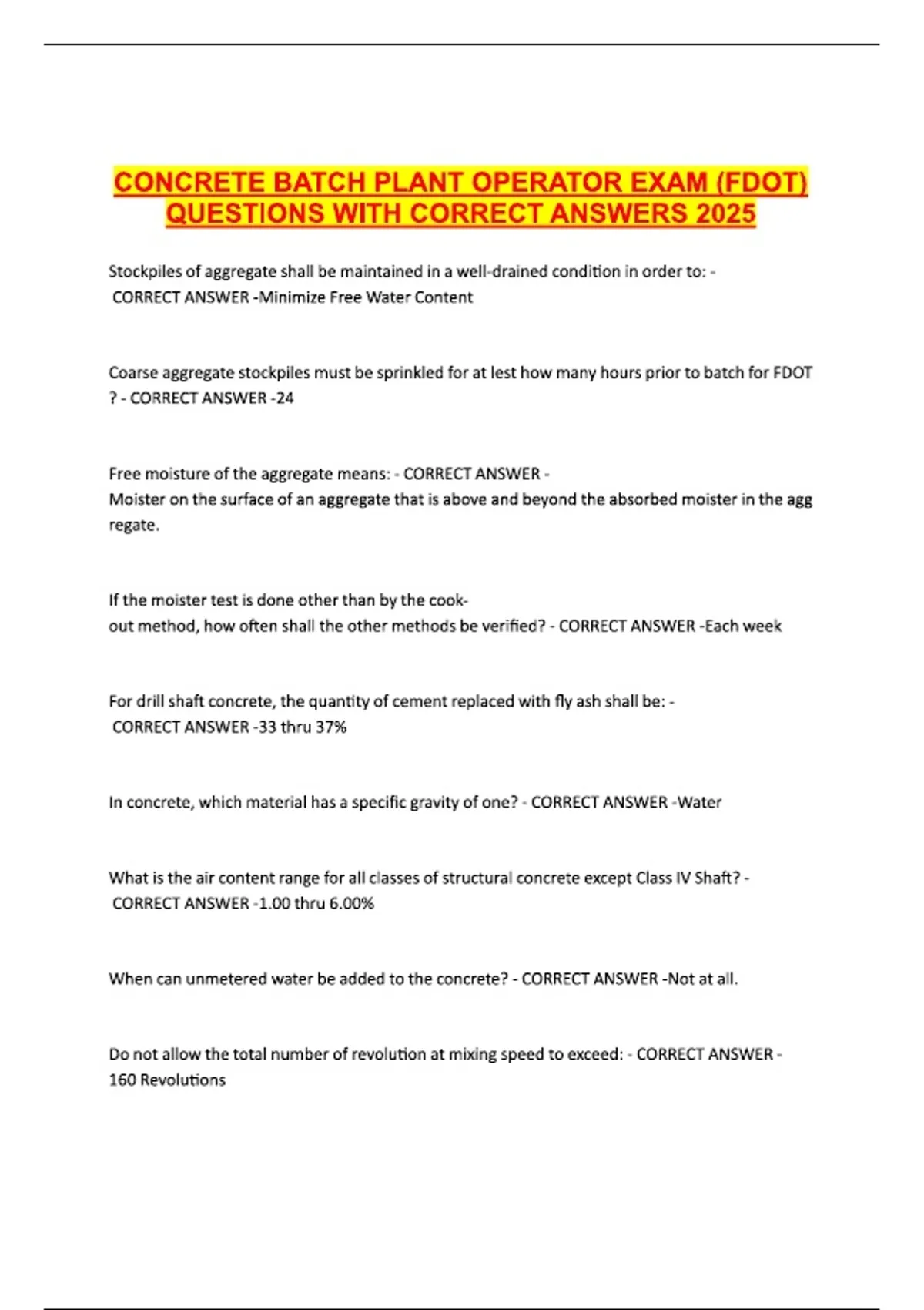 CONCRETE BATCH PLANT OPERATOR EXAM (FDO...QUESTIONS WITH CORRECT ANSWERS