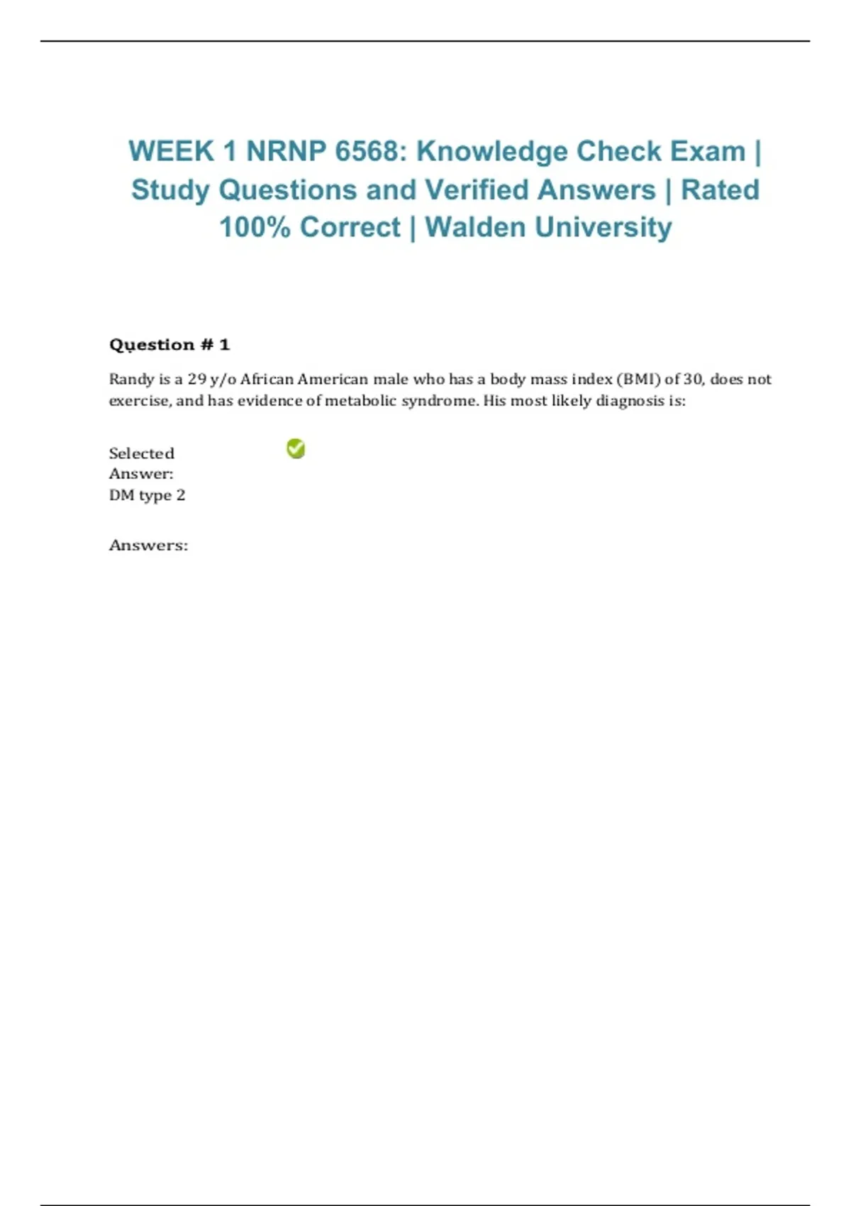 This document contains Week 1 knowledge check exam questions for NRNP 6568 at Walden University. It focuses on introductory advanced nursing practice concepts, foundational clinical reasoning, and course-specific competencies, with verified correct answers to support strong preparation for the 2026/2027 academic year.