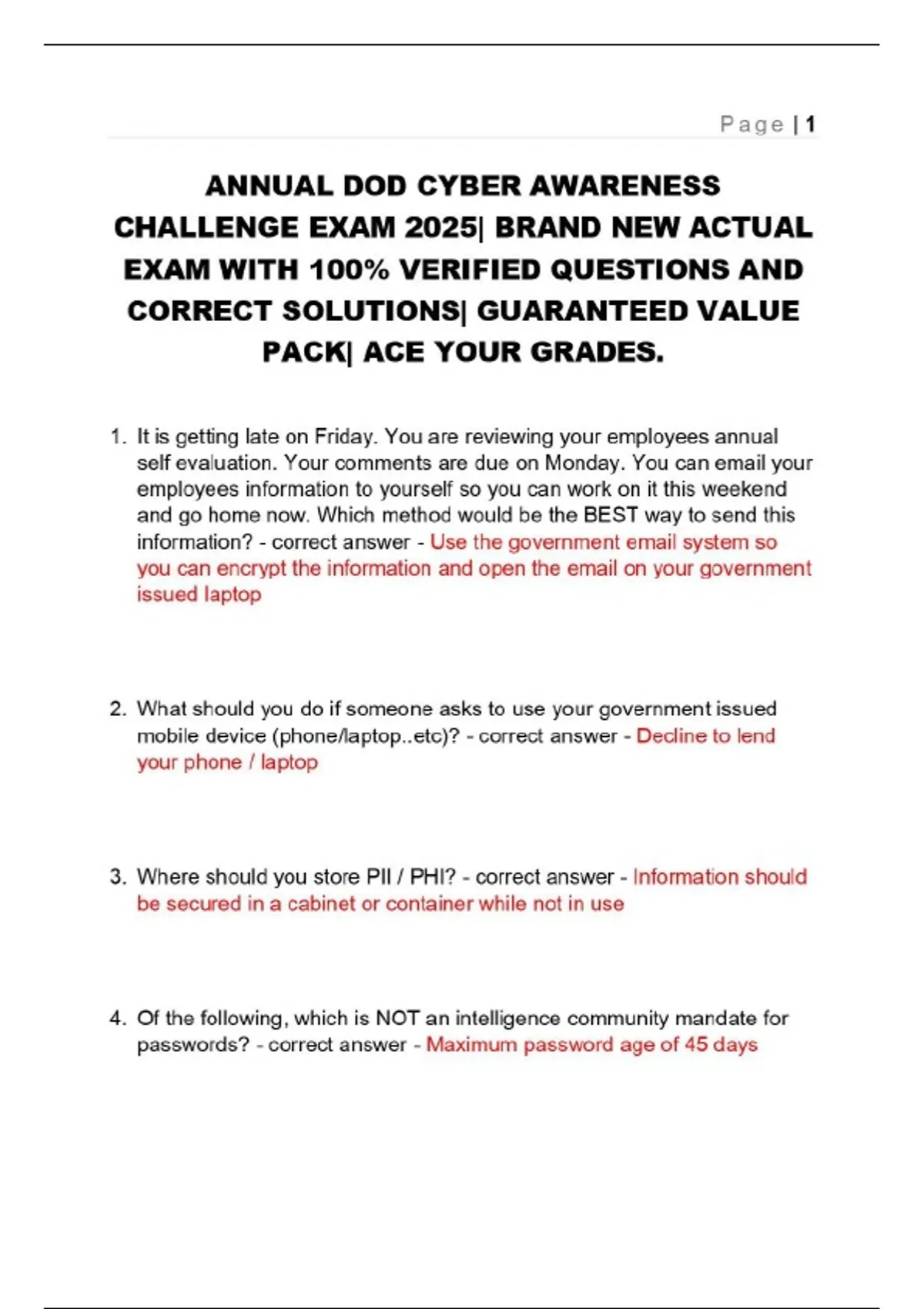 ANNUAL DOD CYBER AWARENESS CHALLENGE EXAM 2025| BRAND NEW ACTUAL EXAM WITH 100% VERIFIED QUESTIONS AND CORRECT SOLUTIONS| GUARANTEED VALUE PACK| ACE YOUR GRADES.