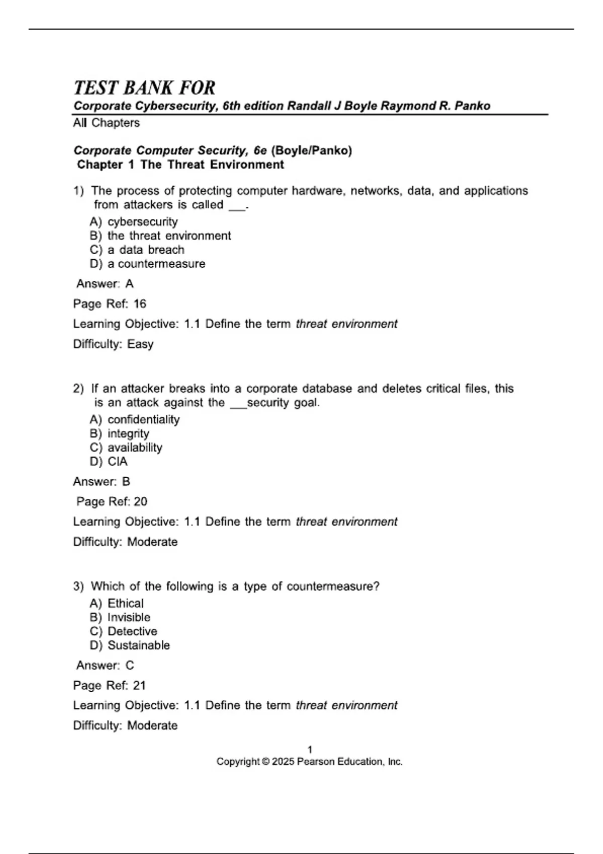This is the complete test bank for Corporate Computer Security (6th Edition) by Randall J. Boyle and Raymond R. Panko. It provides assessment questions for all chapters, beginning with a detailed exploration of the threat environment. Key topics include the CIA triad (Confidentiality, Integrity, and Availability), types of cybersecurity countermeasures (preventive, detective, and corrective), and common attack vectors such as compromised credentials and phishing.