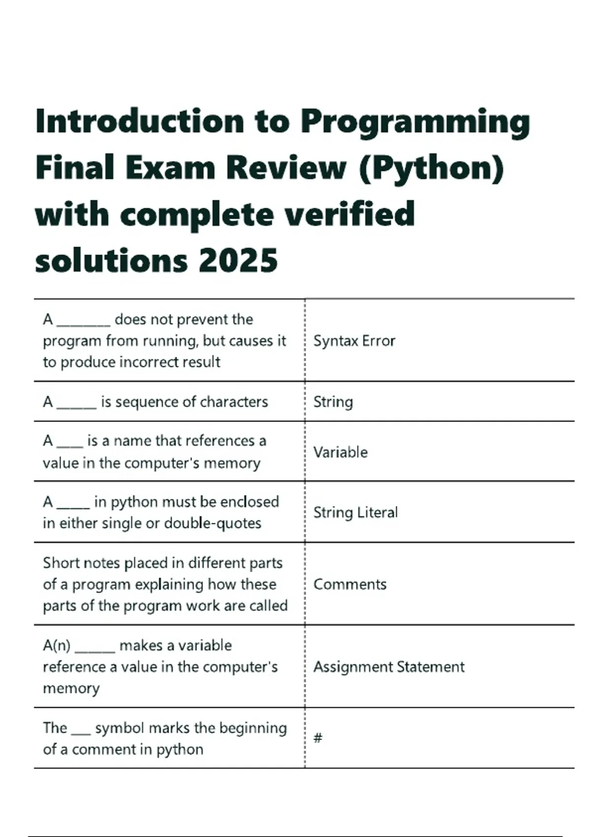 Introduction to Programming Final Exam Review (Python) with complete verified solutions 2025