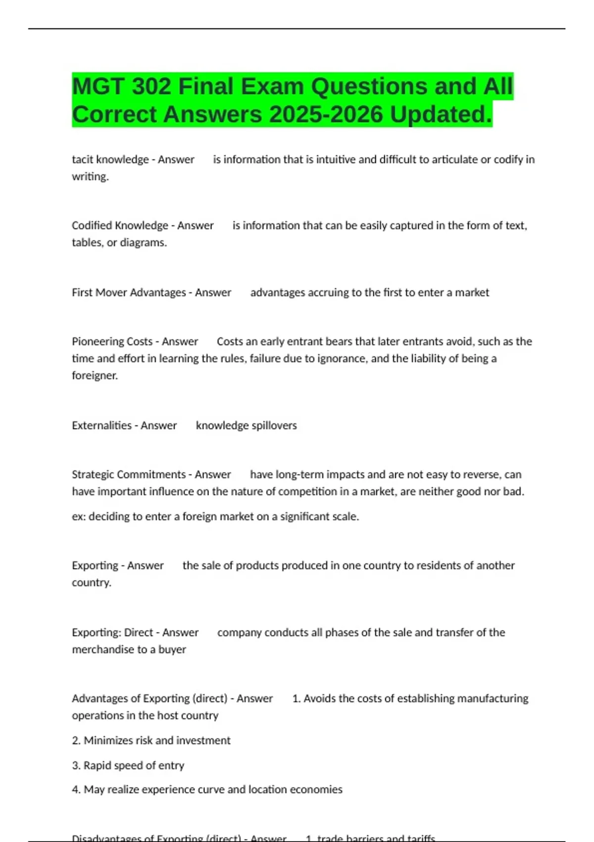 Advantages of Exporting (direct) - Answer 1. Avoids the costs of establishing manufacturing