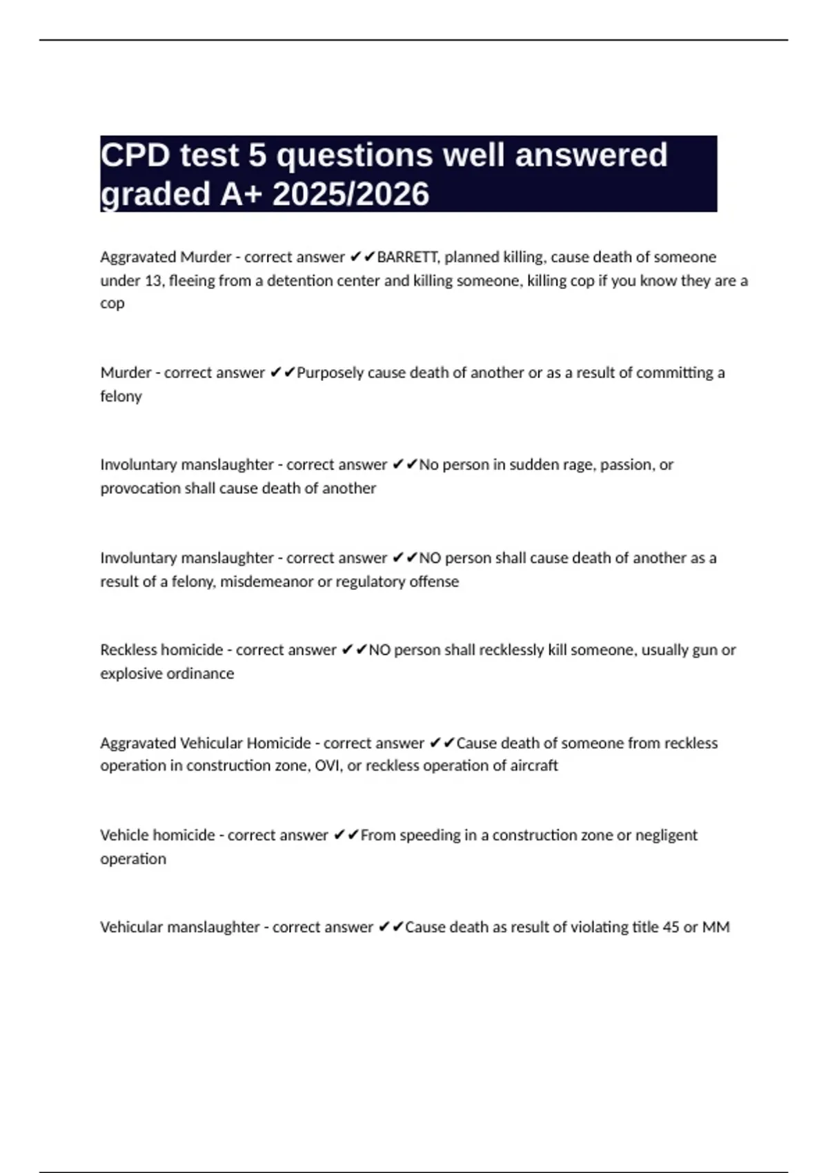 Murder - correct answer ✔✔Purposely cause death of another or as a result of committing a