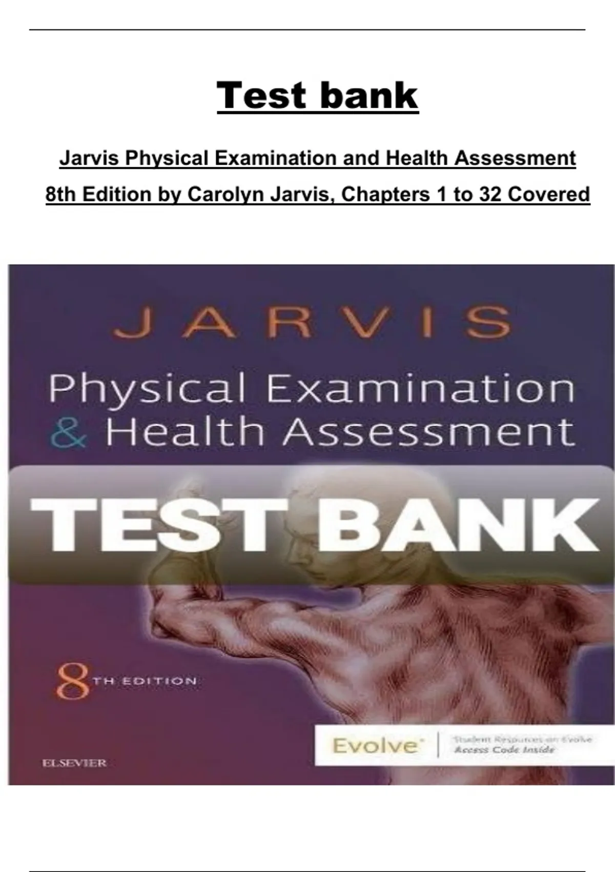 This test bank covers all Chapters 1–32 from Physical Examination and Health Assessment, 8th edition by Carolyn Jarvis. It includes comprehensive exam-style questions focused on health history taking, physical examination techniques, assessment of body systems, documentation, and clinical reasoning used in nursing and health professional education.