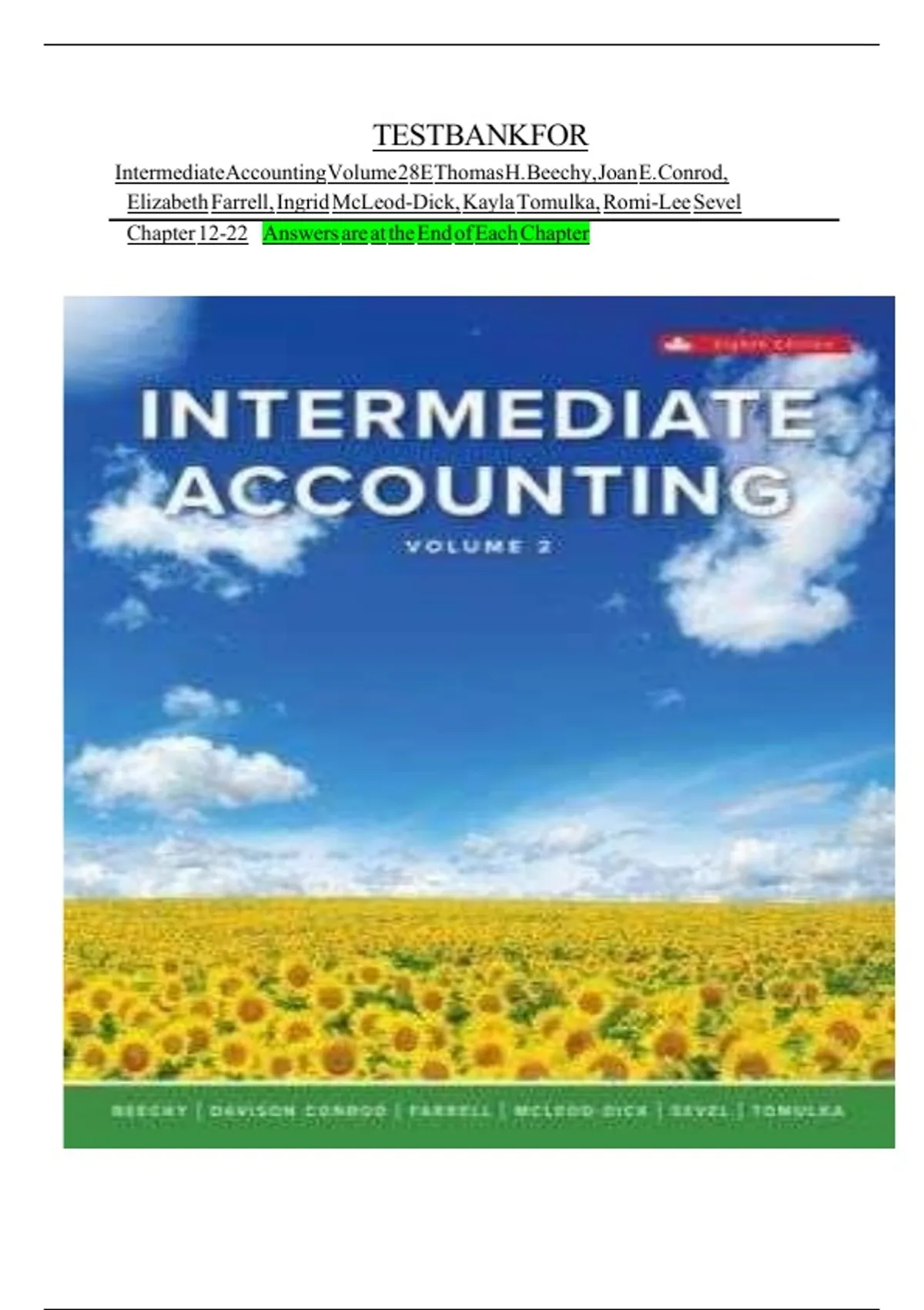 Test Bank for Intermediate Accounting Volume 2 8th Edition | Beechy, Conrod & FarrellAccess the complete Test Bank for Intermediate Accounting, Volume 2 (8th Edition) by Thomas H. Beechy, Joan E. Conrod, and Elizabeth Farrell. This comprehensive resource includes multiple-choice questions, problem sets, and instructor-ready assessments covering advanced financial accounting concepts. Ideal for university accounting programs, educators, tutors, and students seeking structured exam preparation aligned with the textbook.