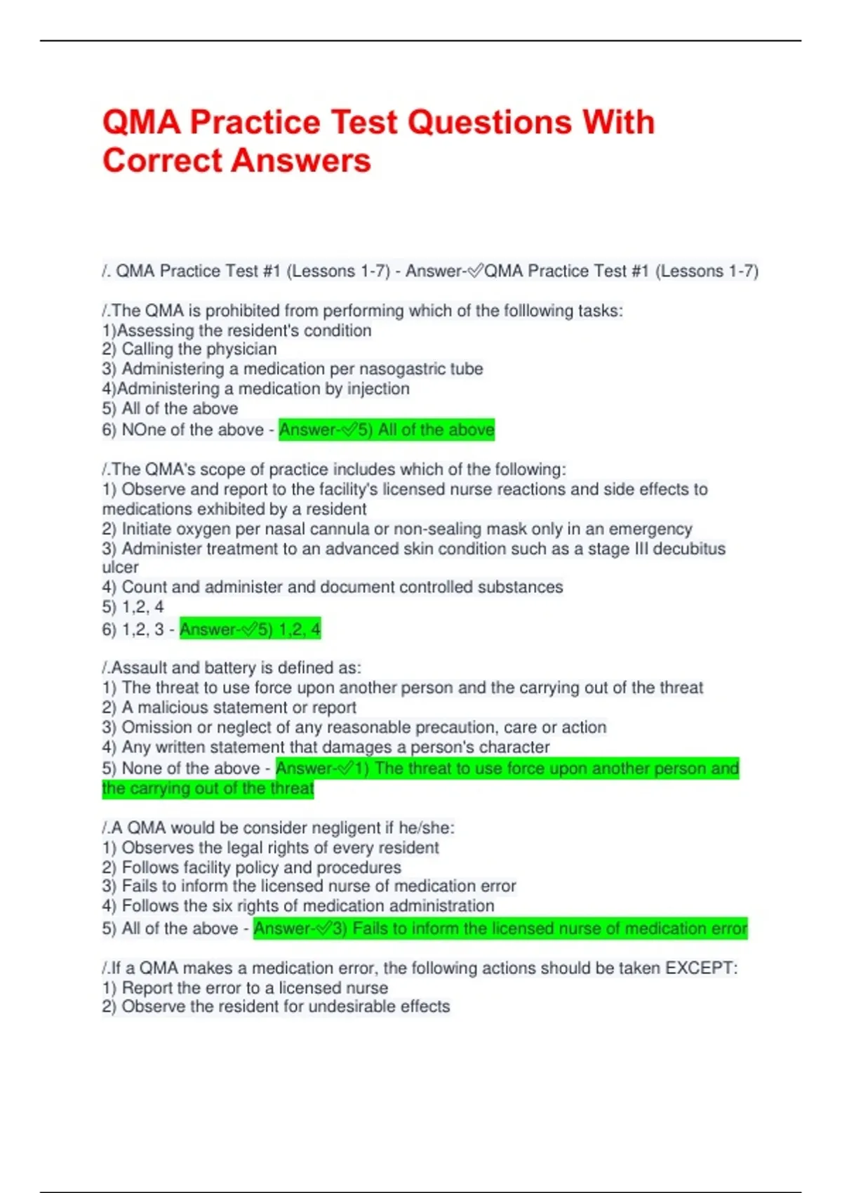 QMA Practice Test Questions With Correct Answers /. QMA Practice Test #1 (Lessons 1-7) - Answer-QMA Practice Test #1 (Lessons 1-7) /.The QMA is prohibited from performing which of the folllowing tasks: 1)Assessing the resident's condition 2) Calling the physician 3) Administering a medication per nasogastric tube 4)Administering a medication by injection 5) All of the above 6) NOne of the above - Answer-5) All of the above /.The QMA's scope of practice includes which of the following: 1) Observe and report to the facility's licensed nurse reactions and side effects to medications exhibited by a resident 2) Initiate oxygen per nasal cannula or non-sealing mask only in an emergency 3) Administer treatment to an advanced skin condition such as a stage III decubitus ulcer 4) Count and administer and document controlled substances 5) 1,2, 4 6) 1,2, 3 - Answer-5) 1,2, 4 /.Assault and battery is defined as: 1) The threat to use force upon another person and the carrying out of the threat 2) A malicious statement or report 3) Omission or neglect of any reasonable precaution, care or action 4) Any written statement that damages a person's character 5) None of the above - Answer-1) The threat to use force upon another person and the carrying out of the threat /.A QMA would be consider negligent if he/she: 1) Observes the legal rights of every resident 2) Follows facility policy and procedures 3) Fails to inform the licensed nurse of medication error 4) Follows the six rights of medication administration 5) All of the above - Answer-3) Fails to inform the licensed nurse of medication error /.If a QMA makes a medication error, the following actions should be taken EXCEPT: 1) Report the error to a licensed nurse 2) Observe the resident for undesirable effects 3) Document the medication error 4) Contact the physician and family to inform them of the medication error 5) Truthfully report the error - Answer-4) Contact the physician and family to inform them of the medication error /.Resident rights include which of the following: 1) The right to voice grievances 2) The right to refuse treatment and be informed of the consequences 3) The right to be free from abuse 4) Both 1 and 2 5) All of the above 6) None of the above - Answer-5) All of the above /.The four elements of successful communication include which of the following: 1) Formulating the message 2) Sending the message 3) Receiving the message 4) Observing the feedback 5) All of the above 6) None of the above - Answer-All of the above /.Verbal communication is: 1) Written words 2)Spoken words 3) Facial expressions 4)Tone of voice 5) Both 1 and 2 6) All of the above - Answer-5) Both 1 and 2 /.General interventions in response to any difficult behavior can include: 1) Remaining calm 2) Trying to confront the resident 3) Attempting to distract or redirect the resident 4) Approaching the resident from the side or back 5) Both 1 and 3 6) Both 2 and 4 - Answer-5) both 1 and 3 /.Severe head trauma, stroke and brain disease can all cause: 1) temporary cognitive impairment 2) permanent cognitive impairment 3) both 1 and 2 4) none of the above - Answer-2) permanent cognitive impairment /.Increased confusion and restlessness in late afternoon, evening and night are symptoms of: 1) catastrophic reaction 2) hallucinations 3) delusions 4) sundowning - Answer-4) sundowning /.When interacting with an anxious resident, you should: 1) take resident to a group activity to help him/her calm down 2)Turn up the music to help the resident relax 3)Provide a quiet, calm environment, away from groups of people and activity 4) both 1 and 2 5) all of the above - Answer-3)Provide a quiet, calm environment, away from groups of people and activity /.When interacting with a combative resident you should: 1) Run and call 911 2) Touch the resident to help calm him/her 3) Remain calm and in control 4) fight back 5) all of the above - Answer-3)remain calm and in control /.Infection can be transmitted by: 1) air 2) contaminated soil and waer 3) objects 4) insects 5) all of the above 6) none of the above - Answer-5) all of the above /.Standard precautions include all EXCEPT: 1) wearing gloves when indicated for resident care 2) wearing a gown, apron, mask and protective eye wear when splashing or contamination may occur 3) washing hands at appropriate times 4) using precautions only for those residents known to have infections - Answer-4) using precautions only for those residents known to have infections /.A contagious disease of the liver caused by a virus and spread by exposure to infected blood, sexual contact or fecal/oral contact is called: 1) scabies 2) tuberculosis 3) hepatitis 4) MRSA - Answer-3)Hepatitis /.A nosocomial infection is: 1) Caused by not washing your hands 2) An infection of the kidneys 3) An infection acquired while in the facility 4) An infection of the lungs - Answer-3) An infection acquired while in the facility /.In a fire emergency you should first: 1) Remove residents from the immediate area of the fire to a place of safety 2) Activate the alarm 3) Extinguish the fire 4) Contain the fire - Answer-1) Remove residents from the immediate area of the fire to a place of safety /.If a resident is choking and a complete blockage of the airway is present you should first 1) Call 911 2) Use the Heimlich maneuver 3) Start chest compressions 4) None of the above 5) All of the above - Answer-2) use the Heimlich maneuver /.If a resident falls you should first: 1) Call for help immediately 2) Try to stop the fall 3) Keep the resident still until the nurse assesses 4) Reassure the resident - Answer-1)Call for help immediately /.When vital parts of the body (brain, heart and lungs) do not get enough blood and the resident has a rapid heart beat, pallor, perspiration, light headedness, chills, fainting, low blood pressure, and confusion this is called: 1) Hemorrhage 2) Shock 3) Cardiac arrest 4) CVA - Answer-2) Shock /.If a resident's heart function and circulation stop a