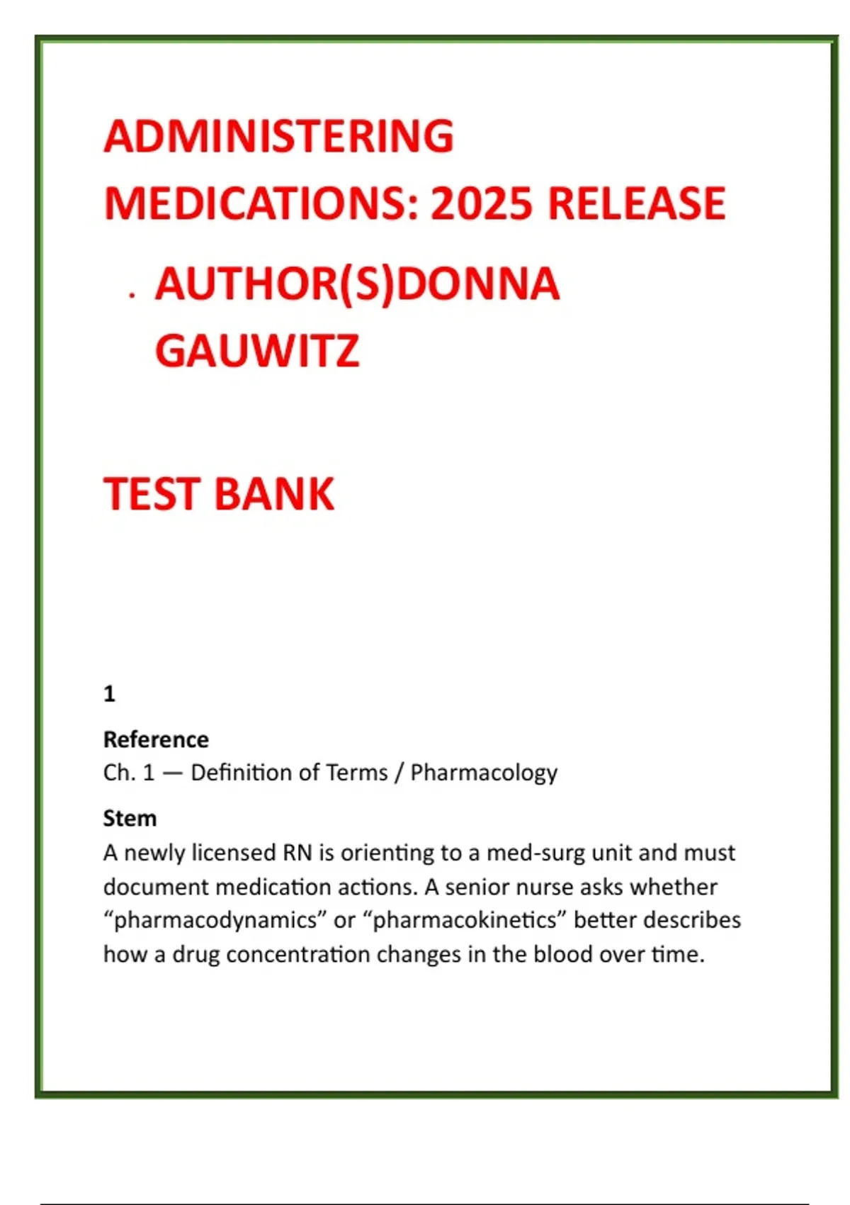 Administering Medications Test Bank 2025 | Gauwitz Nursing Medication Administration MCQs & NCLEX Review Description: Master safe medication administration with this comprehensive digital Nursing Medication Administration Test Bank based on Administering Medications: 2025 Release by Donna Gauwitz. Designed for nursing students and educators, this test bank delivers full chapter-by-chapter coverage with 20 high-quality NCLEX-style MCQs per chapter, each paired with clear, evidence-based rationales to reinforce correct clinical judgment. This resource emphasizes medication safety, dosage accuracy, and error prevention, helping learners translate pharmacology theory into real-world nursing practice. Every question is written at the application, analysis, and evaluation level, mirroring the clinical decision-making required in nursing programs, skills check-offs, and the NCLEX-RN exam. By working through realistic medication-administration scenarios, learners strengthen their ability to prioritize safety, recognize high-alert medications, calculate accurate doses, and apply nursing responsibilities before, during, and after medication administration. The result is greater confidence, fewer errors, and improved exam performance. Ideal for: nursing fundamentals, pharmacology courses, medication-administration exams, clinical skills validation, and NCLEX preparation. Key Features: • Full coverage of Administering Medications: 2025 Release (all chapters) • 20 NCLEX-style MCQs per chapter • Correct answers with detailed, student-friendly rationales • Clinical scenarios focused on patient safety and medication error prevention • Supports dosage calculations, routes of administration, and high-alert drugs • Written by nursing-education standards aligned with Donna Gauwitz’s authoritative framework This test bank is a time-saving, score-boosting study tool for nursing students who want to master medication administration with confidence and clinical accuracy. Keywords: administering medications test bank medication administration MCQs Gauwitz nursing study guide NCLEX medication questions nursing dosage calculations safe medication administration nursing nursing pharmacology test bank medication safety NCLEX review Hashtags: #AdministeringMedications #MedicationAdministration #NursingTestBank #NCLEXMedication #NursingPharmacology #DosageCalculations #MedicationSafety #NursingStudents #NCLEXPrep #ClinicalNursing