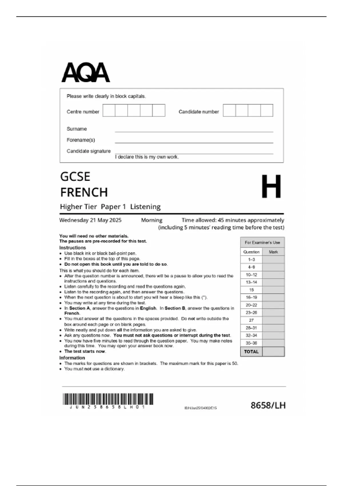 GCSE AQA French Higher Tier Paper 1 (Listening) 2025