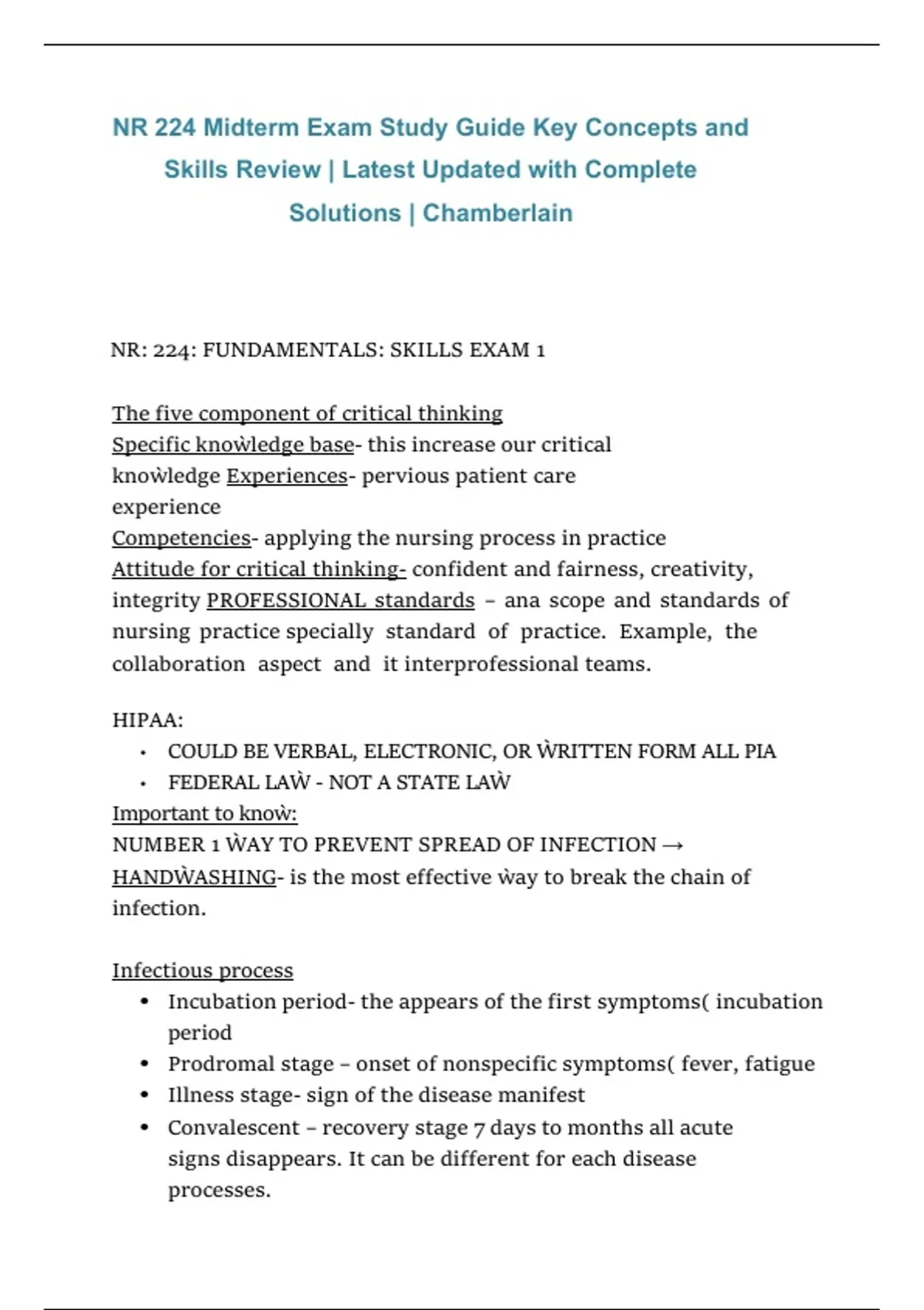 This study guide is designed for the NR 224 Midterm Exam at Chamberlain University and covers all essential key concepts and nursing skills tested on the exam. It includes focused reviews of patient-centered care, safety and infection control, nutrition, elimination, mobility, hygiene, vital signs, documentation, and fundamental nursing interventions, with clear explanations and complete solutions aligned to current course objectives.