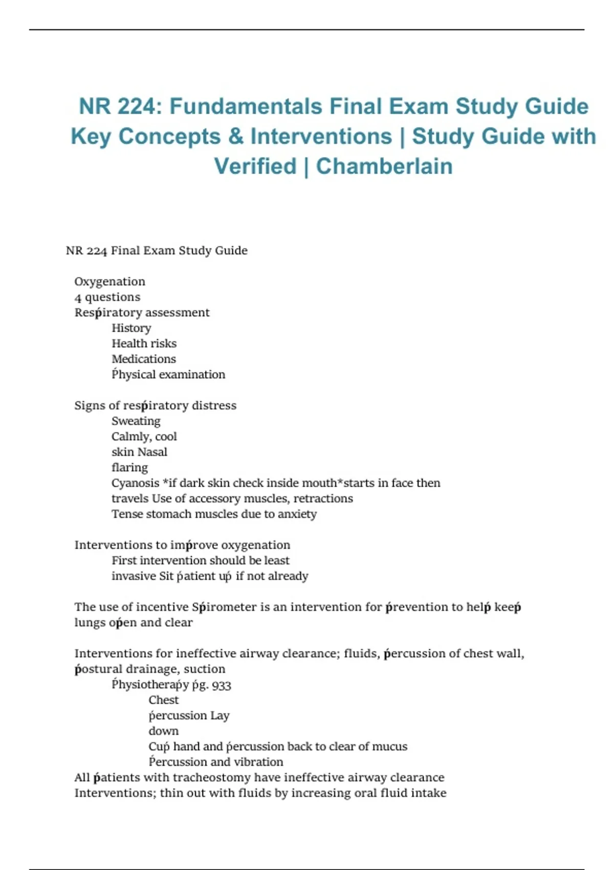 NR 224: Fundamentals Final Exam Study Guide – Key Concepts & Nursing Interventions (Chamberlain University, 2026/2027) comprehensive exam preparation material