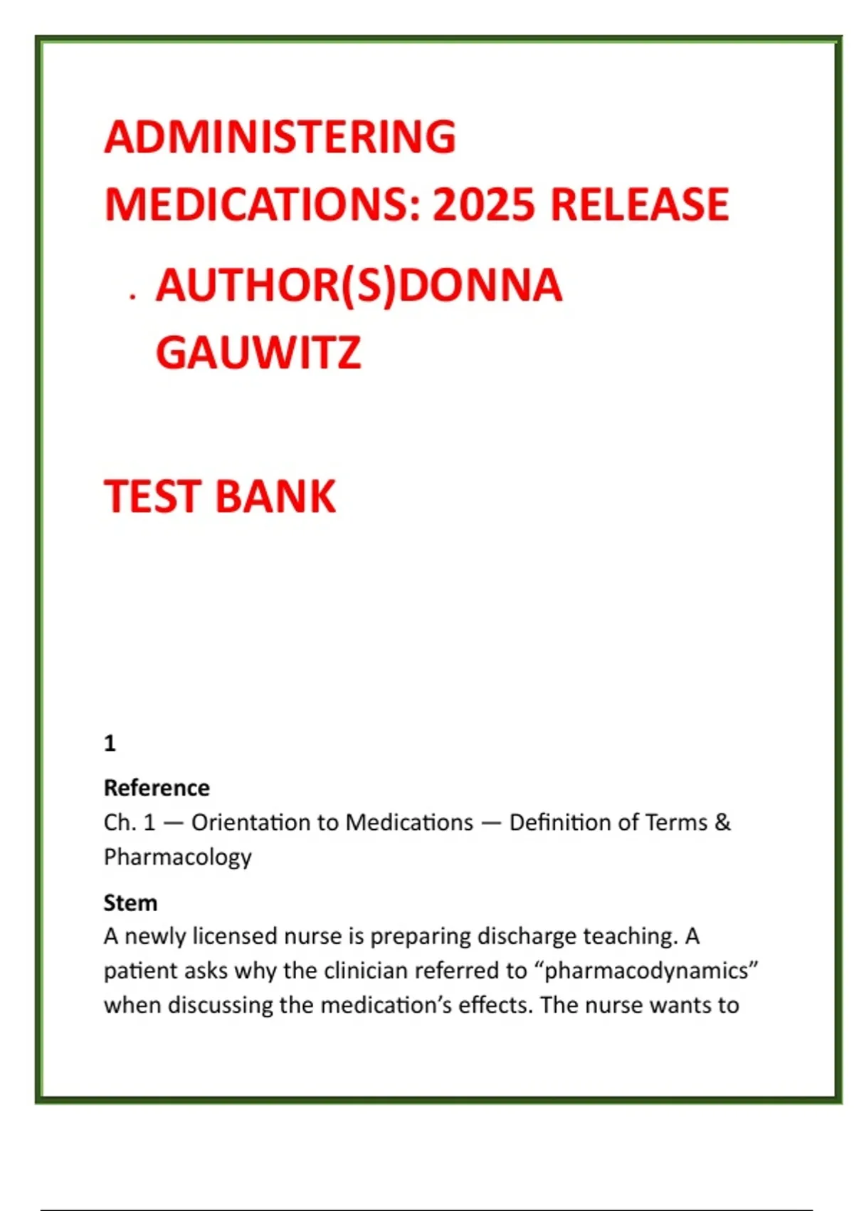 Administering Medications 2025 Test Bank | Gauwitz Nursing Medication Administration MCQs, NCLEX Pharmacology & Dosage Calculations Description: Master medication administration with confidence using this comprehensive digital test bank aligned to Administering Medications: 2025 Release by Donna Gauwitz, a trusted authority in nursing medication education. Designed for nursing students and exam-focused learners, this resource delivers complete chapter-by-chapter coverage with 20 NCLEX-style multiple-choice questions per chapter, each supported by clear, evidence-based rationales. Every question is built around realistic clinical scenarios that mirror medication-administration challenges faced in nursing school, skills labs, and clinical practice. The test bank emphasizes safe medication practices, dosage calculations, routes of administration, high-alert medications, and error prevention, ensuring you develop both exam readiness and real-world clinical judgment. This product is ideal for nursing fundamentals, pharmacology, and medication-administration courses, as well as NCLEX-RN preparation. By practicing with high-quality, clinically accurate MCQs, learners can save study time, boost exam scores, and reduce medication-error risk through consistent reinforcement of nursing safety standards. What’s Included: • Full textbook coverage of Administering Medications: 2025 Release • 20 NCLEX-style MCQs per chapter • Correct answers with detailed rationales • Focus on medication safety, dosage accuracy, and nursing responsibilities • Application- and clinical-judgment–level questions • Digital format for flexible, self-paced study Whether you are preparing for unit exams, skills check-offs, or the NCLEX, this test bank strengthens medication confidence, sharpens prioritization, and supports safe, evidence-based nursing practice—exactly as taught by Donna Gauwitz. Keywords: administering medications test bank medication administration MCQs Gauwitz nursing study guide NCLEX medication questions nursing dosage calculations safe medication administration nursing nursing pharmacology test bank medication safety NCLEX review Hashtags: #AdministeringMedications #NursingTestBank #MedicationAdministration #NCLEXPharmacology #NursingDosageCalculations #MedicationSafety #NursingStudyGuide #NCLEXPrep #PharmacologyNursing #NursingSchoolSuccess