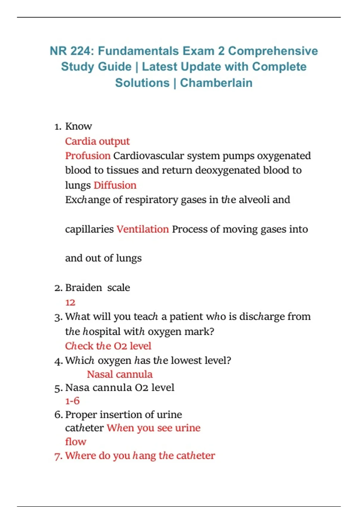 This comprehensive study guide is designed for NR 224 Fundamentals Exam 2 at Chamberlain University and reflects the latest 2026/2027 update. It thoroughly covers all tested concepts including oxygenation, nutrition, bowel elimination, urinary elimination, patient safety, assessment techniques, nursing interventions, complications, and prioritization, with clear explanations and complete solutions aligned to course objectives.