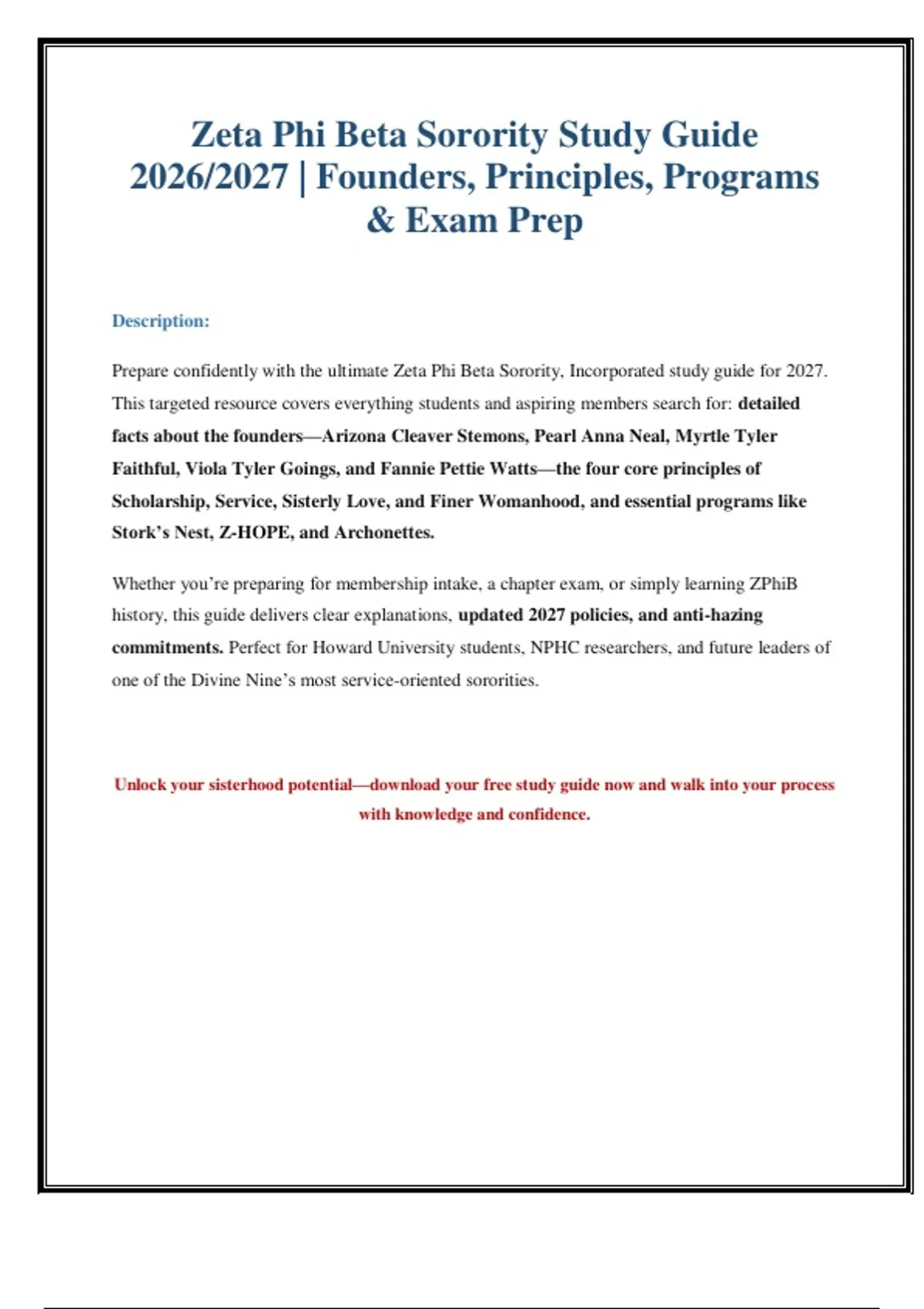 Prepare confidently with the ultimate Zeta Phi Beta Sorority, Incorporated study guide for 2027. This targeted resource covers everything students and aspiring members search for: detailed facts about the founders—Arizona Cleaver Stemons, Pearl Anna Neal, Myrtle Tyler Faithful, Viola Tyler Goings, and Fannie Pettie Watts—the four core principles of Scholarship, Service, Sisterly Love, and Finer Womanhood, and essential programs like Stork’s Nest, Z-HOPE, and Archonettes. Whether you’re preparing for membership intake, a chapter exam, or simply learning ZPhiB history, this guide delivers clear explanations, updated 2027 policies, and anti-hazing commitments. Perfect for Howard University students, NPHC researchers, and future leaders of one of the Divine Nine’s most service-oriented sororities.
