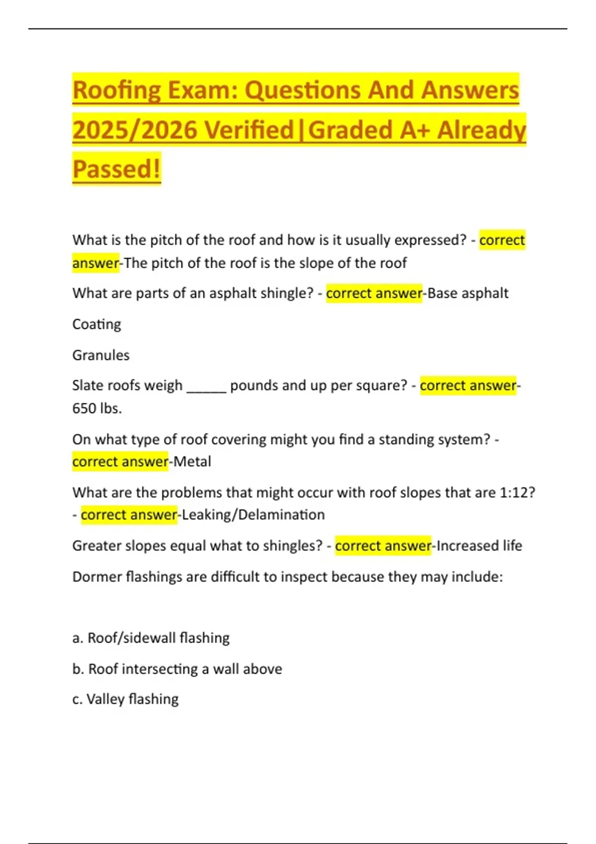 Roofing Exam: Questions And Answers 2025/2026 Verified|Graded A+ Already Passed!