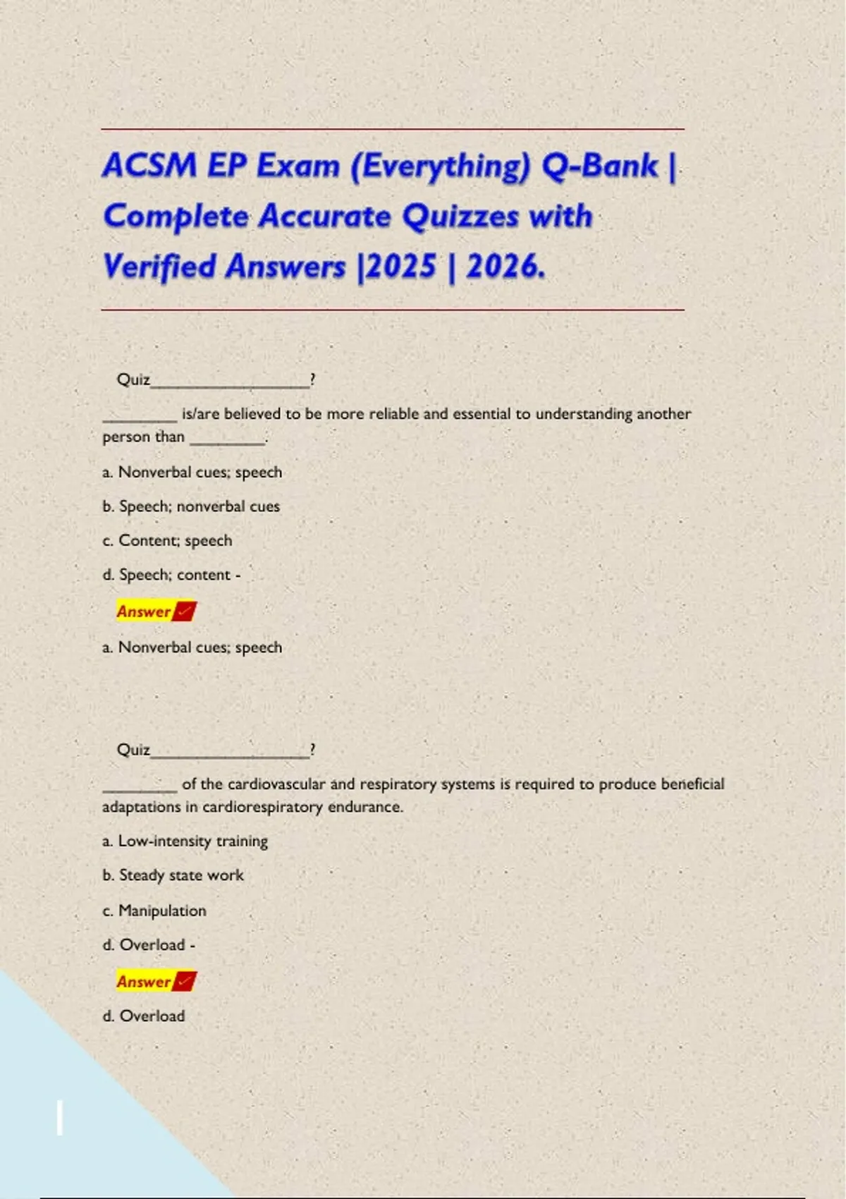 ACSM EP Exam (Everything) Q-Bank | Complete Accurate Quizzes with Verified Answers |2025 | 2026. Quiz_________________? ________ is/are believed to be more reliable and essential to understanding another person than ________. a. Nonverbal cues; speech b. Speech; nonverbal cues c. Content; speech d. Speech; content - Answer a. Nonverbal cues; speech Quiz_________________? ________ of the cardiovascular and respiratory systems is required to produce beneficial adaptations in cardiorespiratory endurance. a. Low-intensity training b. Steady state work c. Manipulation d. Overload - Answer d. Overload Quiz_________________? ________ resistance training features both a lifting phase and lowering phase during each repetition. a. Eccentric b. Concentric c. Dynamic constant external d. Isokinetic - Answer c. Dynamic constant external Quiz_________________? ____________ is the pressure exerted on the arterial wall during the ventricular contraction phase. a. Cardiac output b. Systolic blood pressure c. Diastolic blood pressure d. Stroke volume - Answer b. Systolic blood pressure Quiz_________________? A 1995 joint position statement of the ACSM and CDC recommended that every adult accumulate how many minutes of activity per day? a. 60 minutes b. 10 minutes c. 30 minutes d. 15 minutes - Answer c. 30 minutes Quiz_________________? A 29-year-old male has a bench press weight ratio of 1.48. What rep range would you start him with? a. 4 to 6 b. 10 to 15 c. 8 to 12 d. 15 to 20 - Answer c. 8 to 12 Quiz_________________? A 30-year-old potential client states she just had a physical and was informed by her physician that her total cholesterol and blood pressure looked great. You review her medical history and note she is taking vitamins and antihypertensive medication. Based on this profile, she would be considered as having how many risk factors? a. Two b. Three c. One d. Zero - Answer c. One Quiz_________________? A 33-year-old male who comes to you with previous weight-training experience seeking to enhance general muscular fitness would benefit from how many repetitions per exercise? a. 4 to 6 b. 1 to 3 c. 8 to 12 d. 15 to 20 - Answer c. 8 to 12 Quiz_________________? A 36-year-old female client would like to start playing tennis on the weekends. She has a BMI of 32 and has led a very sedentary lifestyle. Which of the following exercise programs is most appropriate? a. 15-20 minutes of walking, three times per week, and 10-15 minutes of sprint intervals, one day per week. b. 30-45 minutes of walking and jogging intervals, two to three times per week, at 60%-70% of HRR c. Light tennis workouts on Saturday, and walking for 30-45 minutes on Sunday d. 30 minutes of walking per day, five days per week, at 40%-59% of HRR - Answer d. 30 minutes of walking per day, five days per week, at 40%-59% of HRR