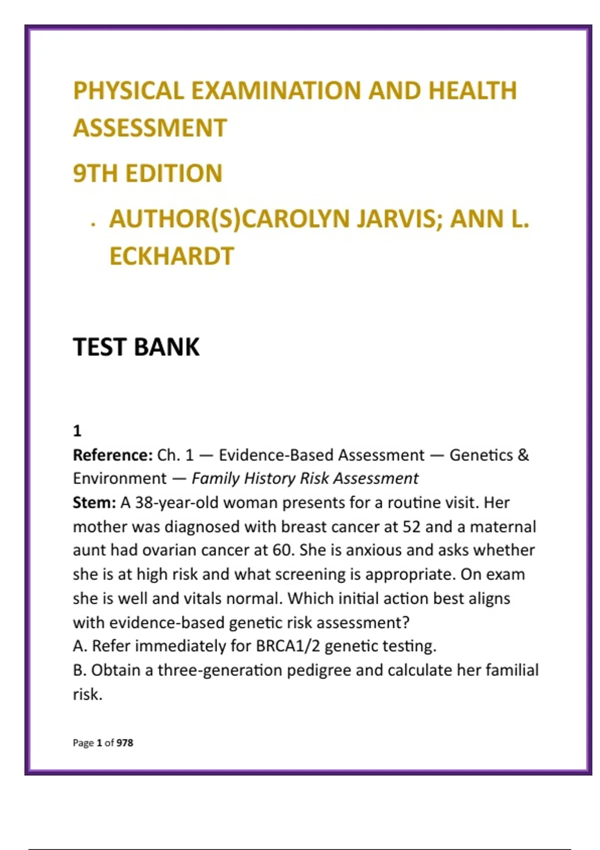 Physical Examination and Health Assessment Test Bank (9th Ed) | Jarvis & Eckhardt | NCLEX-Style Physical Assessment MCQs Description: Master physical examination and health assessment with a comprehensive, exam-ready test bank built directly from Physical Examination and Health Assessment, 9th Edition by Carolyn Jarvis and Ann L. Eckhardt—the gold-standard text in nursing assessment education. This digital test bank delivers full textbook coverage across all units and chapters, with 20 clinically accurate NCLEX-style multiple-choice questions per chapter, each paired with clear, evidence-based rationales. The questions are designed to strengthen clinical reasoning, sharpen assessment accuracy, and build confidence in real-world patient evaluation. Learners progress from comprehensive health history taking to detailed head-to-toe physical examination, system-based assessments, and interpretation of normal versus abnormal findings. Integrated scenarios emphasize cultural considerations, patient safety, documentation accuracy, and sound clinical judgment—skills essential for OSCEs, clinical skills labs, and bedside practice. This test bank is ideal for students and early practitioners seeking efficient, high-yield preparation. It reinforces core assessment concepts while saving study time, making it a practical companion for exams, skills check-offs, and NCLEX-RN readiness. Key Features & Benefits: Full-chapter coverage aligned precisely to Jarvis & Eckhardt (9th Edition) 20 NCLEX-style physical assessment MCQs per chapter Detailed rationales supporting evidence-based practice Focus on clinical reasoning, prioritization, and documentation Supports exam preparation, OSCE performance, and clinical confidence Ideal For: Undergraduate Nursing students (BSN, ADN) Health Assessment and Physical Examination courses Clinical skills and simulation labs NCLEX-RN preparation Early APRN and advanced assessment foundations Keywords: physical examination and health assessment test bank Jarvis and Eckhardt health assessment physical assessment MCQs nursing health assessment nursing study guide NCLEX style physical assessment questions clinical skills nursing test bank head to toe assessment practice questions health assessment exam preparation Hashtags: #HealthAssessmentNursing #PhysicalAssessmentTestBank #JarvisHealthAssessment #NursingClinicalSkills #NCLEXAssessment #HeadToToeAssessment #NursingExamPrep #OSCEPreparation #NursingEducationResources #ClinicalJudgmentNursing