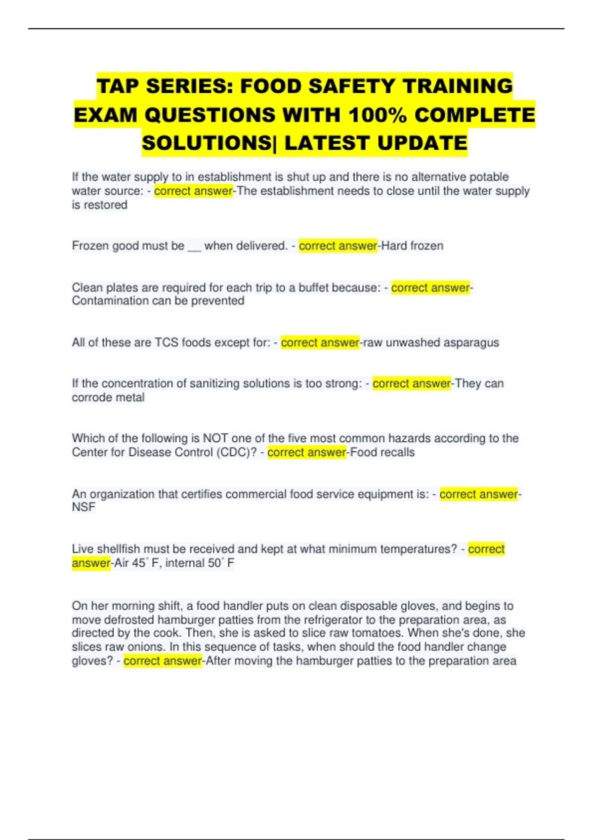 TAP SERIES: FOOD SAFETY TRAINING EXAM QUESTIONS WITH 100% COMPLETE SOLUTIONS| LATEST UPDATE