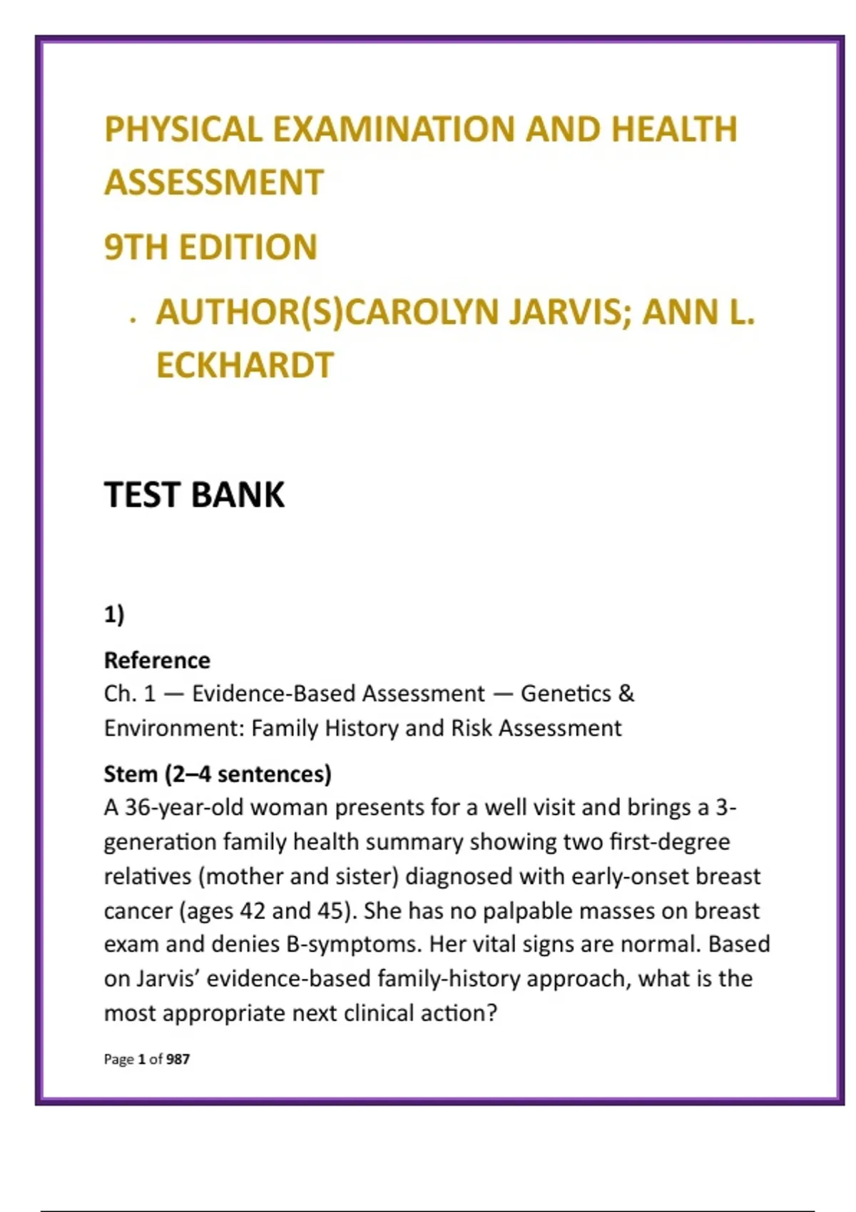 Jarvis Health Assessment Test Bank 9th Edition | Physical Examination NCLEX-RN Practice Questions Master physical examination and health assessment with confidence using this comprehensive digital test bank aligned to Physical Examination and Health Assessment, 9th Edition by Carolyn Jarvis and Ann L. Eckhardt—the gold-standard textbook in nursing and health assessment education. This resource provides full textbook coverage across all units and chapters, with 20 NCLEX-style multiple-choice questions per chapter, each paired with accurate answers and detailed, evidence-based rationales. The questions are purpose-built to strengthen clinical reasoning, sharpen head-to-toe assessment skills, and reinforce real-world clinical judgment expected in nursing programs and licensure exams. Designed for efficiency and mastery, this test bank helps students differentiate normal versus abnormal findings, apply system-based assessment frameworks, and document findings clearly and safely across diverse patient populations. Content integrates cultural considerations, patient safety principles, and prioritization skills, making it ideal for both academic success and clinical practice readiness. Whether you are preparing for health assessment exams, OSCEs, clinical skills labs, or NCLEX-RN, this test bank delivers focused, high-yield practice that saves time while maximizing learning outcomes. Key Features: Full-chapter coverage of Jarvis & Eckhardt, 9th Edition 20 NCLEX-style MCQs per chapter Detailed rationales grounded in evidence-based practice Head-to-toe, system-based, and focused assessment scenarios Emphasis on clinical judgment, documentation, and patient safety 100% digital, instant-access study solution Ideal For: BSN and ADN nursing students Health Assessment and Physical Examination courses Clinical skills labs and OSCE preparation NCLEX-RN exam readiness Early APRN and advanced assessment foundations Keywords: physical examination and health assessment test bank Jarvis and Eckhardt health assessment health assessment nursing MCQs physical assessment test bank nursing clinical skills nursing study guide NCLEX-style assessment questions health assessment exam prep physical examination MCQs Hashtags: #HealthAssessmentNursing #PhysicalExaminationTestBank #JarvisEckhardt #NursingClinicalSkills #NCLEXPreparation #PhysicalAssessmentMCQs #NursingEducationResources #OSCEPreparation #HealthAssessmentExam #NursingTestBank