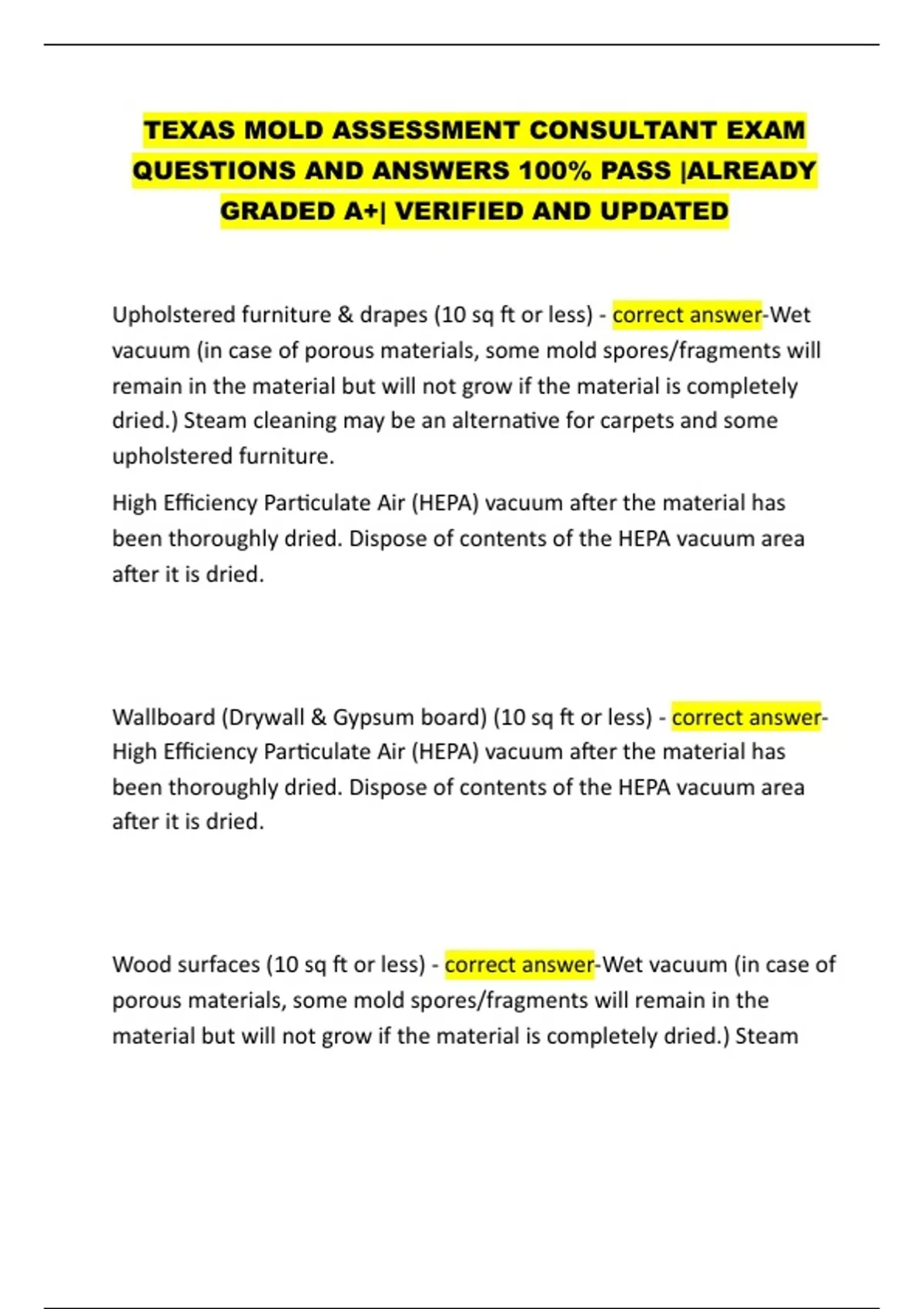 TEXAS MOLD ASSESSMENT CONSULTANT EXAM QUESTIONS AND ANSWERS 100% PASS |ALREADY GRADED A+| VERIFIED AND UPDATED