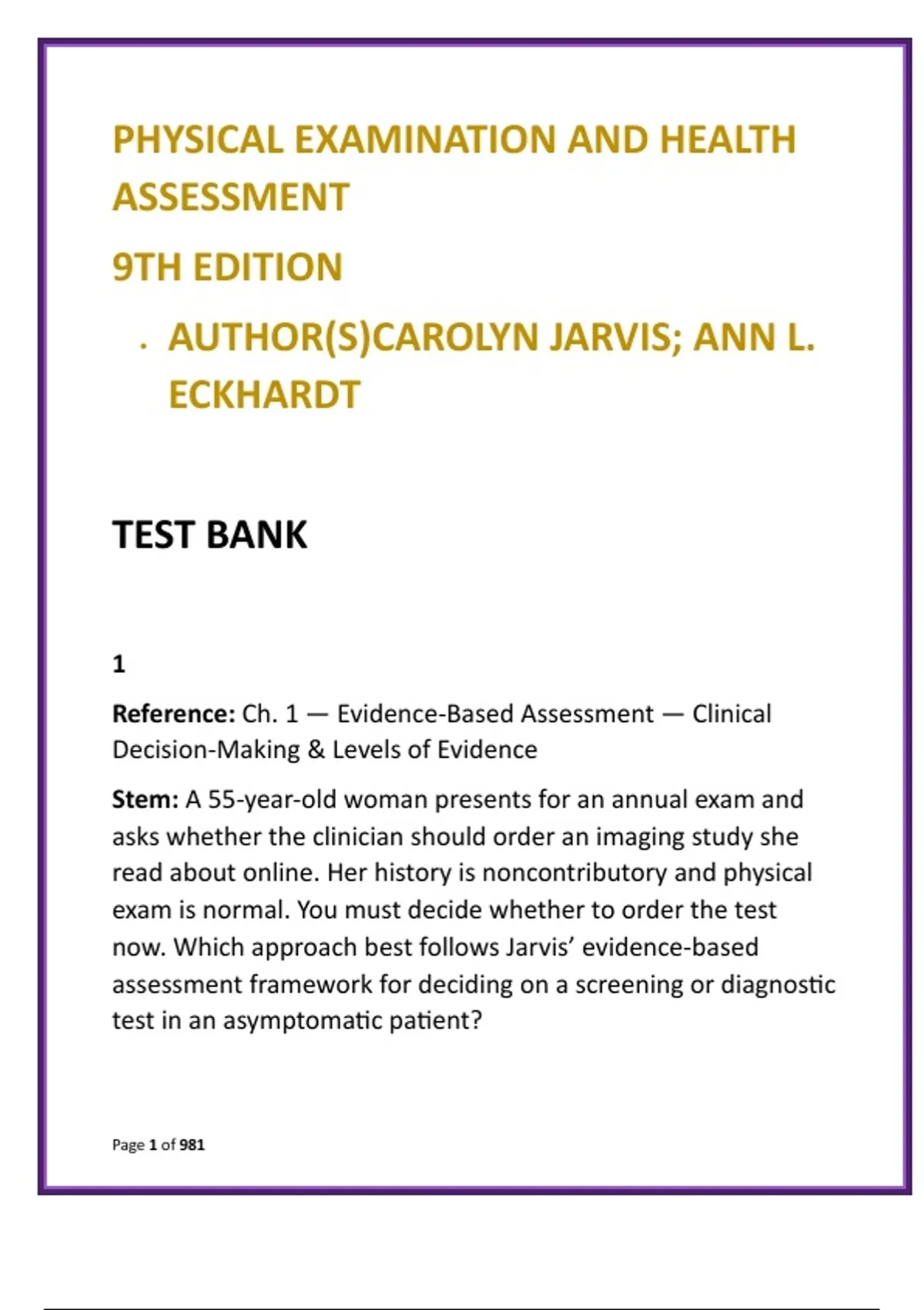 Master physical examination and health assessment with this comprehensive, exam-focused test bank aligned to Physical Examination and Health Assessment, 9th Edition by Carolyn Jarvis and Ann L. Eckhardt—the gold-standard text in nursing assessment education. Designed for high-performance learning, this digital resource delivers full textbook coverage across all units and chapters, reinforcing clinical judgment, documentation accuracy, and patient safety. Each chapter includes 20 NCLEX-style multiple-choice questions with correct answers and detailed, evidence-based rationales, ensuring concept mastery and readiness for exams, OSCEs, and clinical skills validation. Questions integrate clinical reasoning and realistic assessment scenarios to strengthen head-to-toe examination skills, system-based assessment, and recognition of normal versus abnormal findings—across diverse patient populations. This test bank is ideal for time-efficient, skill-based preparation. It supports accurate data collection, prioritization, and interpretation—key competencies for safe, confident patient evaluation in academic and clinical settings. Key Features: Full-chapter coverage of Jarvis & Eckhardt, 9th Edition 20 clinically accurate NCLEX-style MCQs per chapter In-depth rationales grounded in current nursing standards Scenarios covering health history, head-to-toe and system assessments Emphasis on cultural considerations, patient safety, and documentation Digital format for flexible, on-demand study Ideal For: Undergraduate Nursing (BSN, ADN) Health Assessment and Physical Examination courses Clinical skills labs and OSCE preparation NCLEX-RN review and early APRN foundations Build confidence, sharpen assessment accuracy, and prepare for real-world practice with a test bank trusted by nursing students and educators. Keywords: physical examination and health assessment test bank Jarvis and Eckhardt test bank health assessment nursing MCQs physical assessment test bank NCLEX-style assessment questions clinical skills nursing study guide head-to-toe assessment questions health assessment exam prep Hashtags: #HealthAssessmentTestBank #PhysicalExaminationNursing #JarvisEckhardt #NCLEXAssessment #NursingClinicalSkills #PhysicalAssessmentMCQs #OSCEPreparation #NursingEducationResources #HealthAssessmentStudyGuide #NCLEXRNPrep