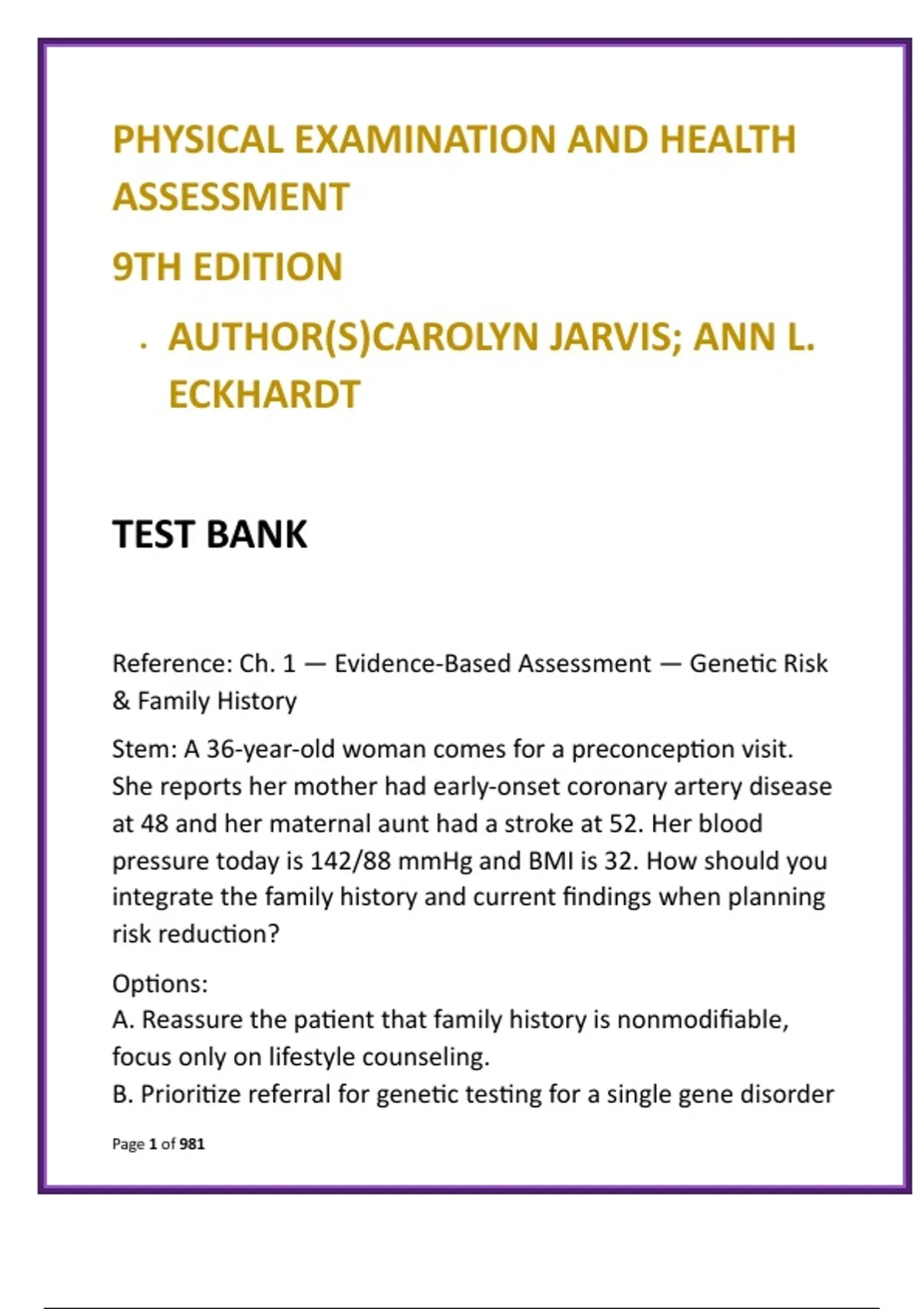 Master physical examination and health assessment with this comprehensive digital test bank aligned to Jarvis & Eckhardt’s Physical Examination and Health Assessment, 9th Edition—the gold-standard textbook in nursing education. Designed for efficiency and clinical accuracy, this resource delivers full textbook coverage across all units and chapters, with 20 NCLEX-style multiple-choice questions (MCQs) per chapter and clear, evidence-based rationales to reinforce learning and clinical judgment. Each question set is built to strengthen head-to-toe assessment proficiency, sharpen normal vs. abnormal finding recognition, and enhance documentation, prioritization, and patient safety awareness. Integrated clinical reasoning scenarios mirror real-world practice, preparing learners for written exams, OSCEs, skills check-offs, and NCLEX-RN readiness. This test bank is ideal for BSN and ADN students, health assessment and physical examination courses, clinical skills labs, and early APRN foundations. It supports time-efficient study by targeting high-yield assessment concepts while reinforcing cultural considerations and system-based evaluation. What’s included: Full-chapter coverage of Jarvis & Eckhardt (9th Edition) 20 NCLEX-style MCQs per chapter with verified rationales Scenarios covering comprehensive history, system-based exams, and documentation Focus on clinical judgment, patient safety, and cultural competence Digital, self-paced format for flexible study Learning outcomes: Improved accuracy in head-to-toe physical exams Stronger recognition of normal vs. abnormal findings Enhanced clinical reasoning and documentation skills Increased confidence for NCLEX and clinical skills assessments Keywords: physical examination and health assessment test bank Jarvis and Eckhardt health assessment health assessment nursing MCQs physical assessment test bank clinical skills nursing study guide NCLEX-style assessment questions head-to-toe assessment MCQs physical examination nursing test bank Hashtags: #HealthAssessment #PhysicalExamination #JarvisAndEckhardt #NursingTestBank #ClinicalSkillsNursing #NCLEXPreparation #PhysicalAssessmentMCQs #NursingEducation #OSCEPrep #HealthAssessmentNursing