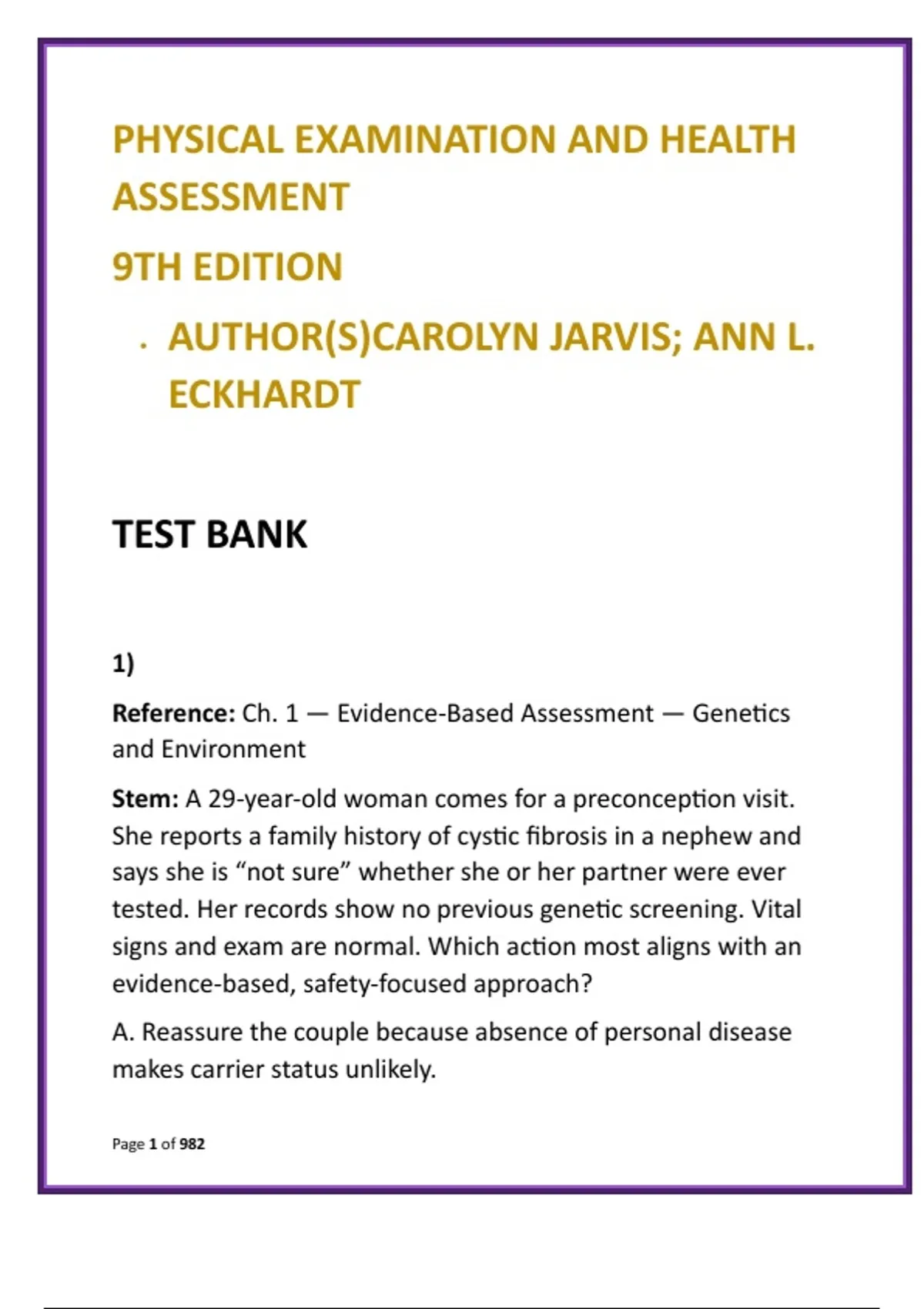 Physical Examination & Health Assessment Test Bank 9e | Jarvis & Eckhardt | NCLEX-Style Physical Assessment MCQs Description: Master comprehensive health assessment with this high-yield Physical Examination and Health Assessment Test Bank (9th Edition) aligned to the gold-standard text by Carolyn Jarvis and Ann L. Eckhardt. Designed for nursing students and early advanced practice learners, this digital study resource delivers full chapter coverage with 20 NCLEX-style multiple-choice questions per chapter, each supported by clear, evidence-based rationales that strengthen clinical reasoning and exam readiness. Built to reinforce real-world practice, this test bank emphasizes head-to-toe physical examination, system-based assessment, and accurate recognition of normal vs. abnormal findings—critical skills for OSCEs, skills labs, and patient care. Questions integrate cultural considerations, patient safety, documentation standards, and prioritization to mirror clinical decision-making you will face in coursework and on the NCLEX-RN. What’s included: Complete coverage of all units and chapters from Jarvis & Eckhardt, 9th Edition 20 clinically accurate MCQs per chapter written in NCLEX style Detailed rationales grounded in current nursing assessment principles Scenarios targeting health history, physical examination, and clinical judgment Focus on documentation accuracy, safety, and prioritization Why students choose this resource: Saves time with targeted, exam-relevant practice Reinforces foundational and advanced assessment concepts Improves confidence and accuracy in patient evaluation Strengthens readiness for Health Assessment exams, OSCEs, and NCLEX-RN Ideal for: BSN and ADN programs, Health Assessment and Physical Examination courses, clinical skills labs, NCLEX preparation, and early APRN assessment foundations. Keywords: physical assessment test bank Jarvis and Eckhardt test bank health assessment nursing MCQs physical examination MCQs NCLEX health assessment questions clinical skills nursing study guide health assessment exam prep nursing physical assessment practice Hashtags: #PhysicalAssessmentTestBank #HealthAssessmentNursing #JarvisEckhardt #NCLEXAssessment #NursingClinicalSkills #PhysicalExamination #NursingStudyResources #HealthAssessmentMCQs #OSCEPrep #NursingEducation