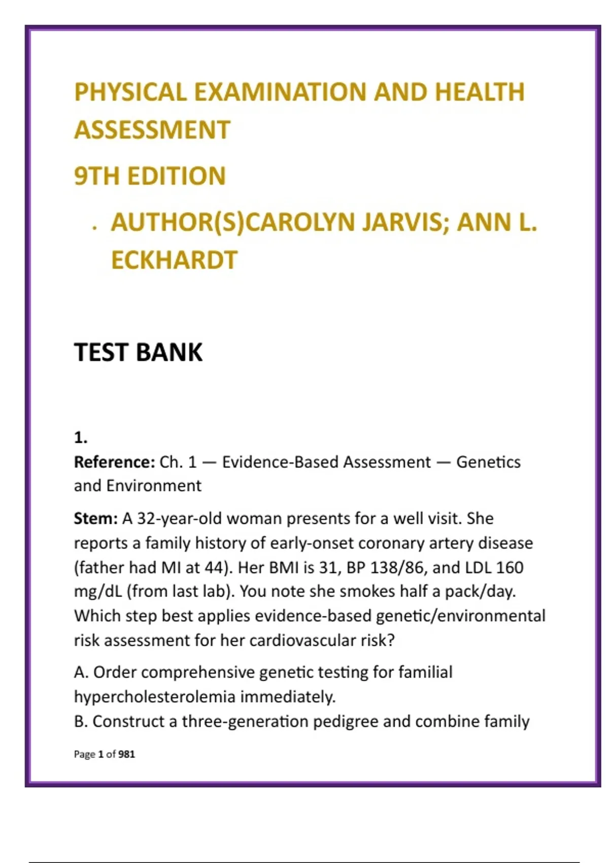 Physical Examination & Health Assessment Test Bank – Jarvis & Eckhardt 9th Edition | NCLEX-Style MCQs & Nursing Clinical Skills