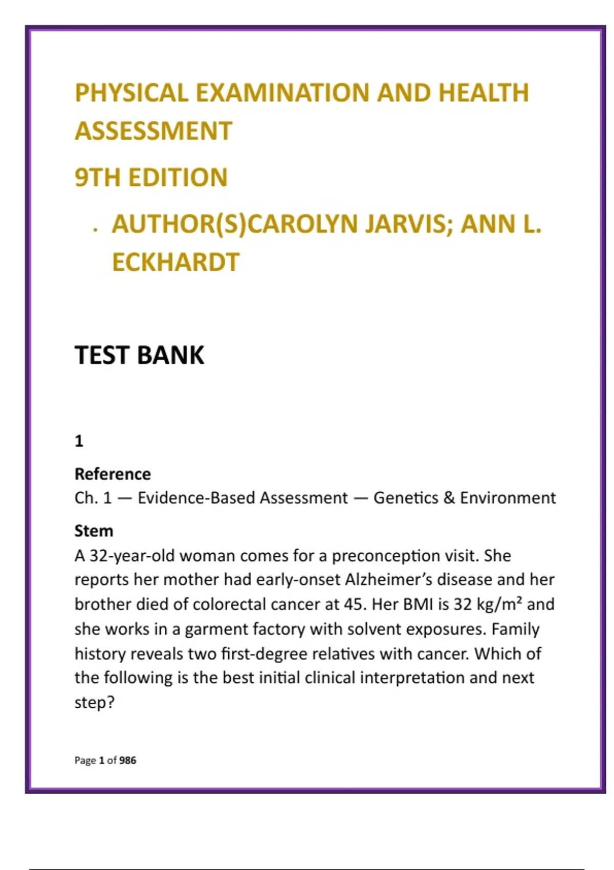 Physical Examination and Health Assessment Test Bank (9th Ed) | Jarvis & Eckhardt | NCLEX-Style Physical Assessment MCQs Description: Master comprehensive physical assessment with this premium Physical Examination and Health Assessment Test Bank (9th Edition) aligned to Jarvis & Eckhardt, the gold standard in health assessment education. Designed for nursing students and early advanced practice learners, this digital study resource delivers full-chapter coverage across all units with 20 clinically accurate NCLEX-style MCQs per chapter, each paired with evidence-based rationales to strengthen clinical judgment. Built for efficiency and exam readiness, this test bank reinforces head-to-toe assessment, system-based examinations, and health history taking while sharpening your ability to distinguish normal versus abnormal findings. Scenario-driven questions integrate cultural considerations, patient safety, documentation, and prioritization, mirroring real-world practice and OSCE expectations. Whether you are preparing for health assessment exams, skills labs, OSCEs, or NCLEX-RN, this resource accelerates mastery through focused, skill-based learning—saving time while improving accuracy and confidence in patient evaluation. Key Features: Full textbook alignment: Jarvis & Eckhardt, Physical Examination and Health Assessment (9th Edition) 20 NCLEX-style MCQs per chapter with detailed rationales Comprehensive coverage: health history, head-to-toe, and system-based assessment Emphasis on clinical reasoning, safety, and documentation Digital, searchable format for rapid review and targeted practice Ideal For: Undergraduate Nursing (BSN, ADN) Health Assessment and Physical Examination courses Clinical skills labs and competency validation NCLEX-RN preparation Early APRN and advanced assessment foundations Achieve confident, accurate assessments and exam-ready performance with a test bank trusted by nursing educators and students alike. Keywords: physical examination and health assessment test bank Jarvis and Eckhardt test bank health assessment nursing MCQs physical assessment NCLEX questions clinical skills nursing study guide head-to-toe assessment practice normal vs abnormal findings nursing OSCE health assessment preparation Hashtags: #HealthAssessmentNursing #PhysicalExamination #JarvisEckhardt #NCLEXStyleQuestions #NursingTestBank #ClinicalSkillsNursing #OSCEPreparation #NursingEducation #PhysicalAssessmentMCQs #NCLEXPrep