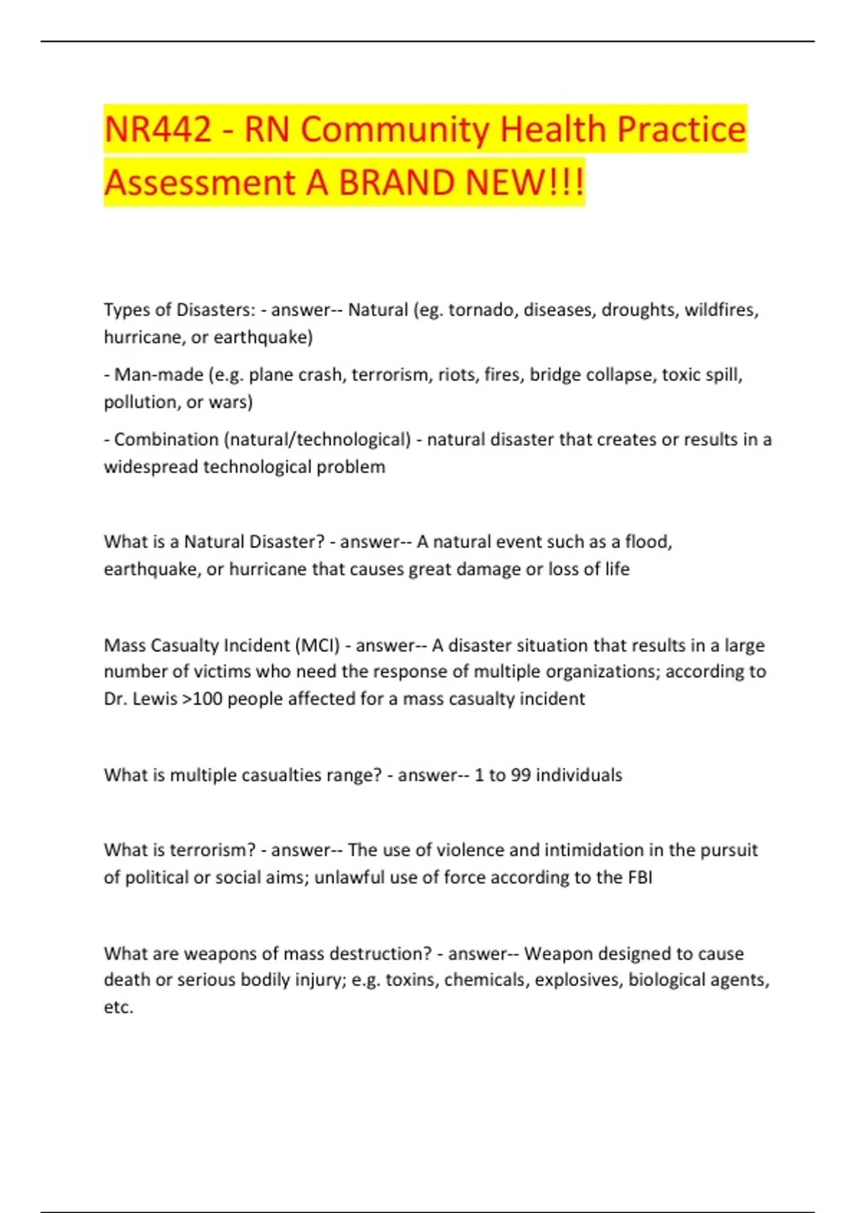 Types of Disasters: - answer-- Natural (eg. tornado, diseases, droughts, wildfires, hurricane, or earthquake) - Man-made (e.g. plane crash, terrorism, riots, fires, bridge collapse, toxic spill, pollution, or wars) - Combination (natural/technological) - natural disaster that creates or results in a widespread technological problem What is a Natural Disaster? - answer-- A natural event such as a flood, earthquake, or hurricane that causes great damage or loss of life Mass Casualty Incident (MCI) - answer-- A disaster situation that results in a large number of victims who need the response of multiple organizations; according to Dr. Lewis >100 people affected for a mass casualty incident What is multiple casualties range? - answer-- 1 to 99 individuals What is terrorism? - answer-- The use of violence and intimidation in the pursuit of political or social aims; unlawful use of force according to the FBI What are weapons of mass destruction? - answer-- Weapon designed to cause death or serious bodily injury; e.g. toxins, chemicals, explosives, biological agents, etc.