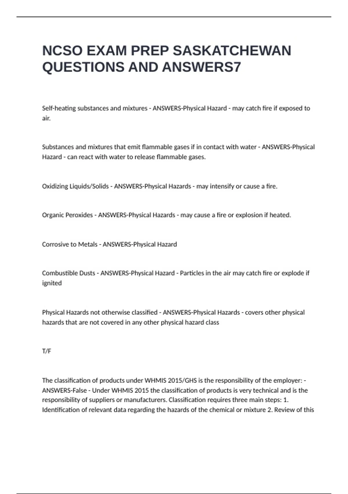 ANSWERS-False - Under WHMIS 2015 the classification of products is very technical and is the