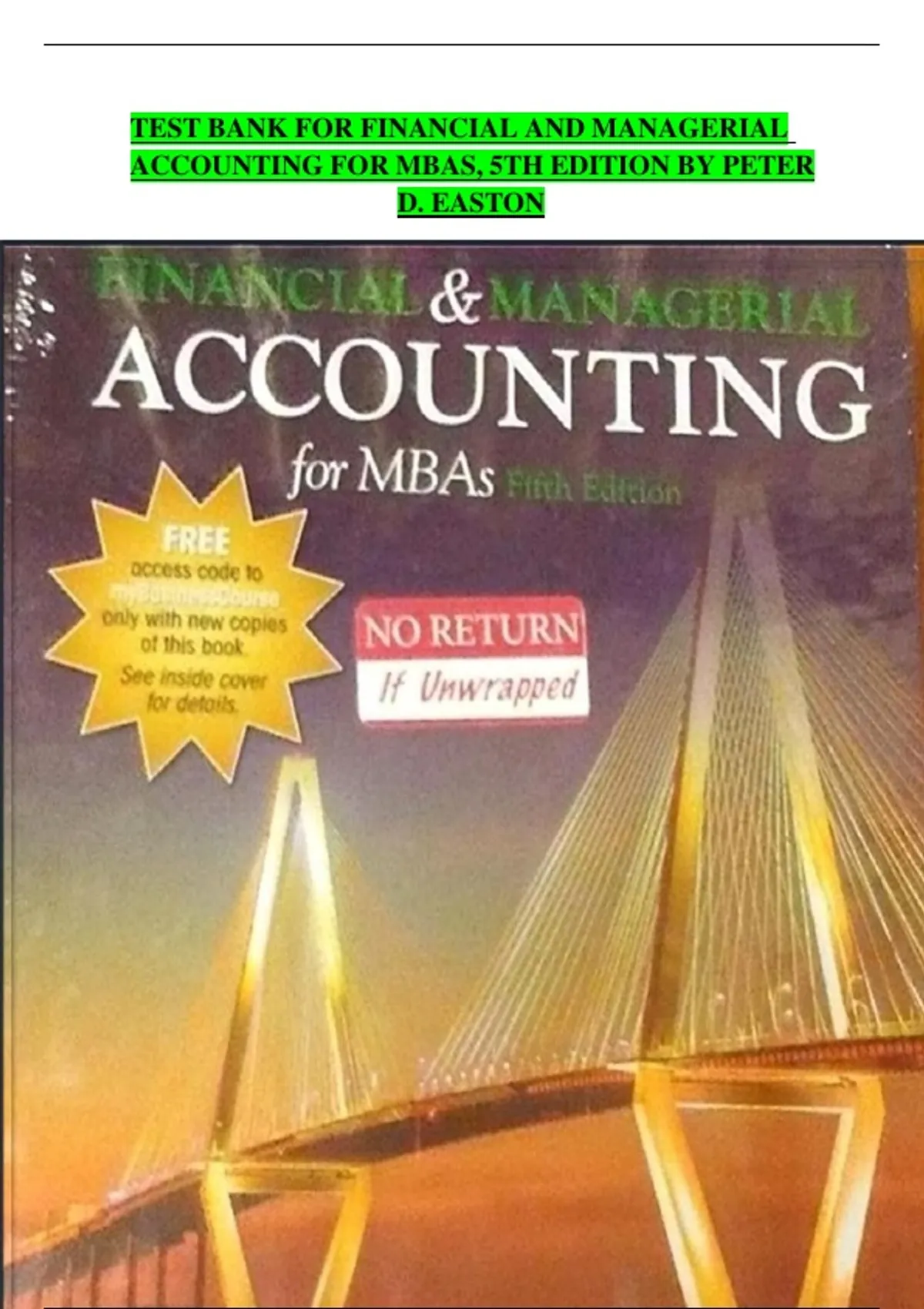 This document contains a comprehensive test bank for Financial and Managerial Accounting for MBAs (5th Edition) by Peter D. Easton. It includes practice questions and answers covering key topics such as financial statements, cost behavior, managerial decision-making, and accounting analysis, making it suitable for exam preparation and revision for MBA-level accounting courses.