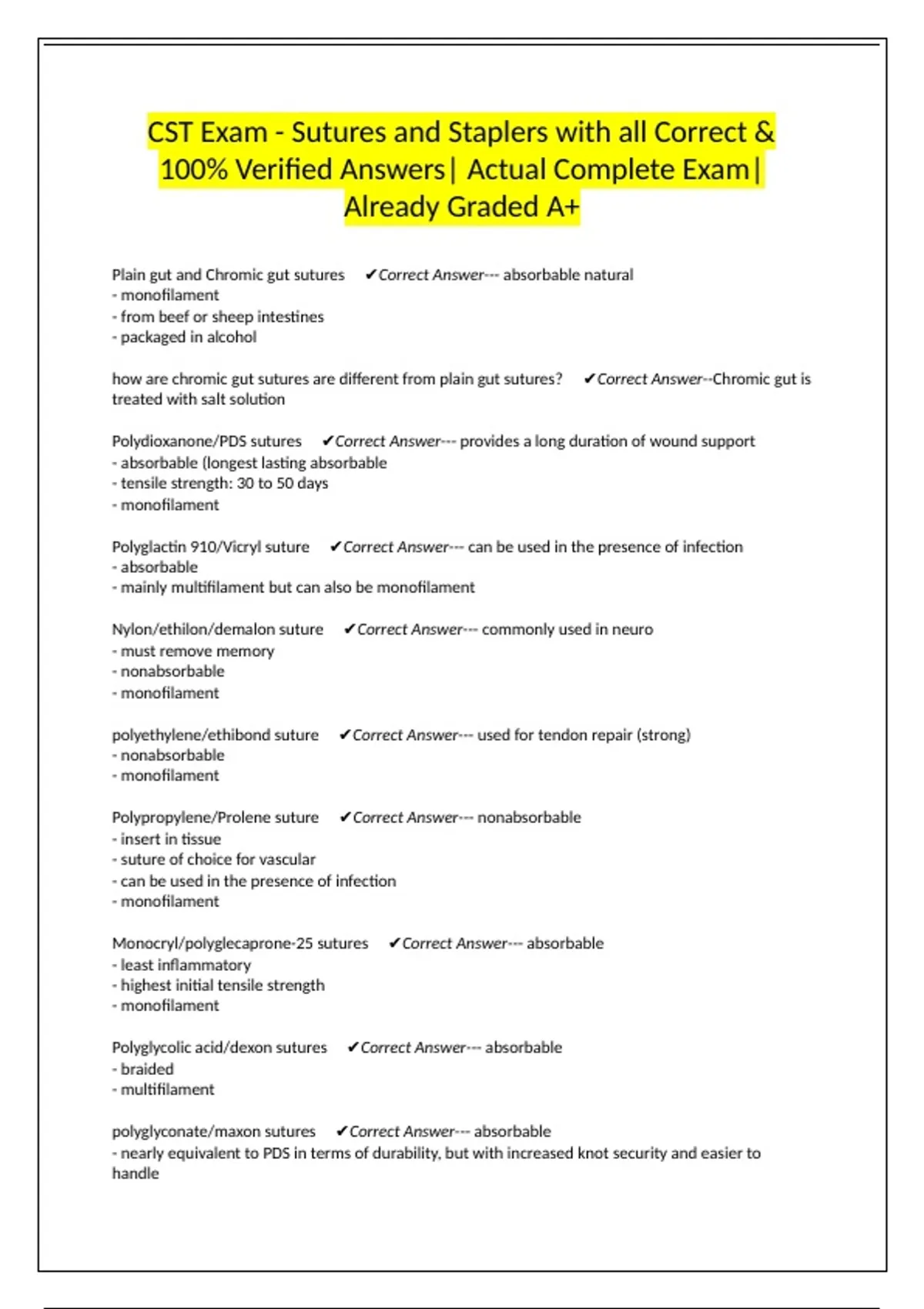 CST Exam - Sutures and Staplers with all Correct & 100% Verified Answers| Actual Complete Exam| Already Graded A+