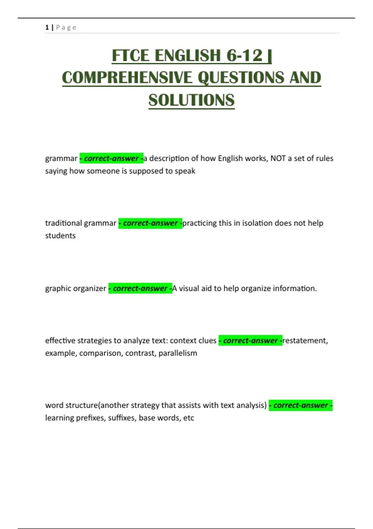 FTCE ENGLISH 6-12 | COMPREHENSIVE QUESTIONS AND SOLUTIONS