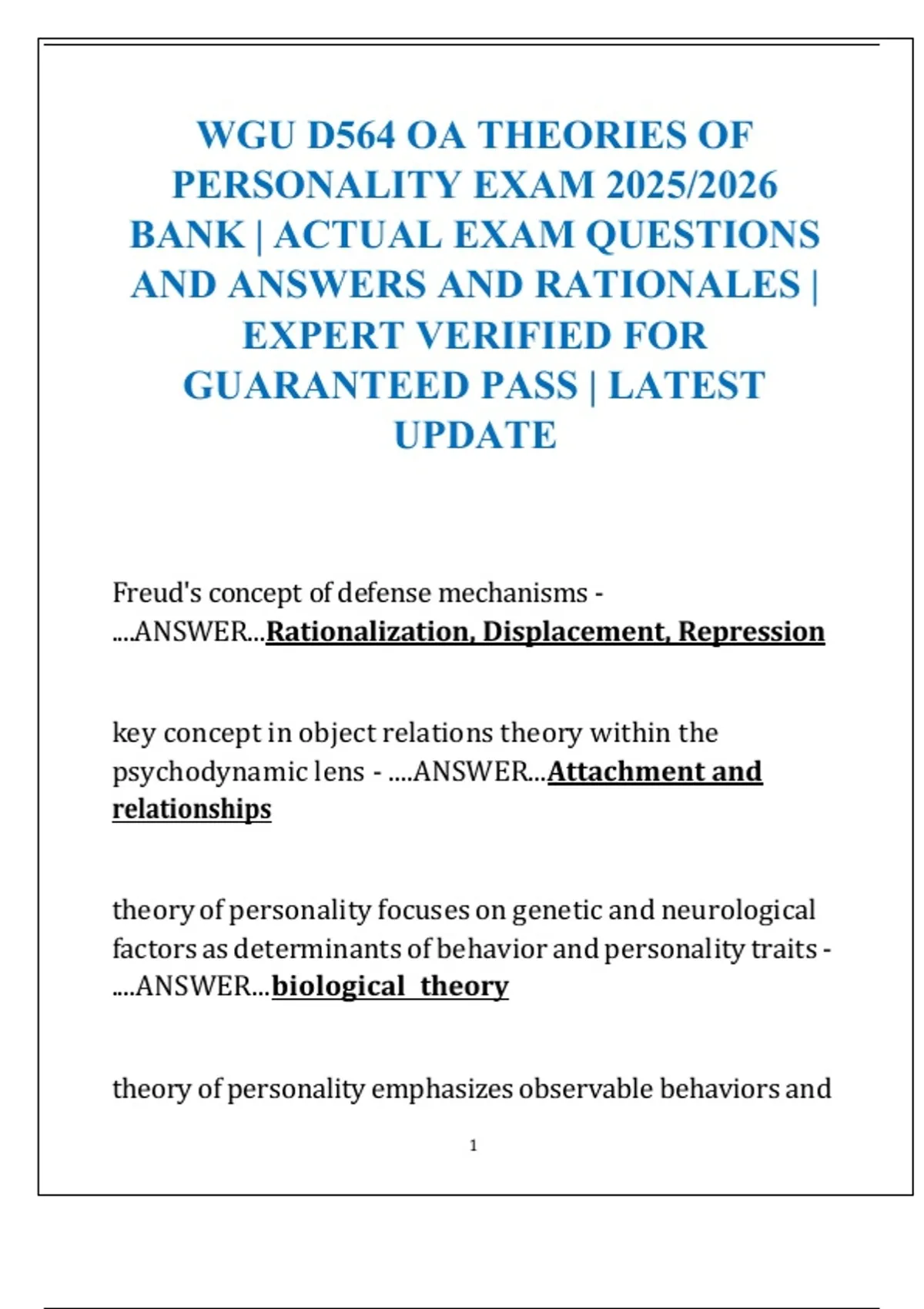 WGU D564 OA THEORIES OF PERSONALITY EXAM 2025/2026 BANK | ACTUAL EXAM QUESTIONS AND ANSWERS AND RATIONALES | EXPERT VERIFIED FOR GUARANTEED PASS | LATEST UPDATE