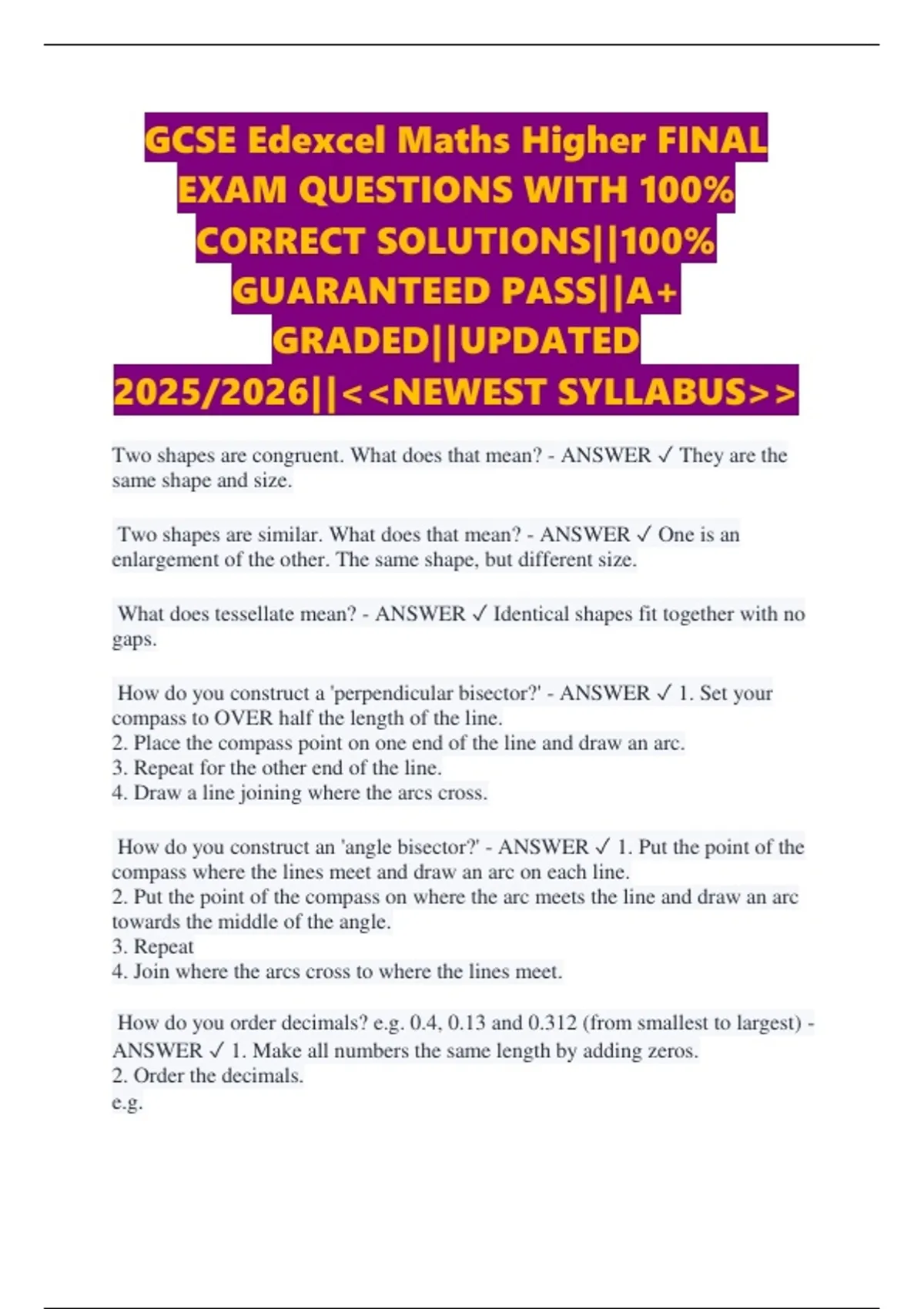 GCSE Edexcel Maths Higher FINAL EXAM QUESTIONS WITH 100% CORRECT SOLUTIONS||100% GUARANTEED PASS||A+ GRADED||UPDATED 2025/2026||&lt;&lt;NEWEST SYLLABUS&gt;&gt; Two shapes are congruent. What does that mean? - ANSWER They are the same shape and size. Two shapes are similar. What does that mean? - ANSWER One is an enlargement of the other. The same shape, but different size. What does tessellate mean? - ANSWER Identical shapes fit together with no gaps. How do you construct a 'perpendicular bisector?' - ANSWER 1. Set your compass to OVER half the length of the line. 2. Place the compass point on one end of the line and draw an arc. 3. Repeat for the other end of the line. 4. Draw a line joining where the arcs cross. How do you construct an 'angle bisector?' - ANSWER 1. Put the point of the compass where the lines meet and draw an arc on each line. 2. Put the point of the compass on where the arc meets the line and draw an arc towards the middle of the angle. 3. Repeat 4. Join where the arcs cross to where the lines meet. How do you order decimals? e.g. 0.4, 0.13 and 0.312 (from smallest to largest) - ANSWER 1. Make all numbers the same length by adding zeros. 2. Order the decimals. e.g. 0.130, 0.312, 0.400 How do you estimate a calculation? - ANSWER Round each number to 1 significant figure and then work out. When asked to 'criticise' a question, what are the typical mistakes? - ANSWER 1. No timescale in the question. 2. The question is leading. 3. The catagories overlap. 4. No 'other' or 'more than' option. How do you write a number as a product of primes? e.g. 20 - ANSWER Use a prime factor tree. What is the LCM (Lowest Common Multiple)? e.g. LCM of 7 and 4. - ANSWER The LCM is the first common multiple of both numbers. e.g. The LCM of 7 and 4 is 28. What is the HCF (Highest Common Factor)? e.g. HCF of 15 and 20. - ANSWER The HCF is the largest factor of both numbers. e.g. The HCF of 15 and 20 is 5. What is y³ x y⁵ - ANSWER y⁸ (add the powers) What is y⁸ ÷ y² - ANSWER y⁶ (subtract the powers) What is (y²)⁴ - ANSWER y⁸ (multiply the powers) How do you calculate 'percentage change?' - ANSWER change ÷ original x 100 How do you expand brackets? - ANSWER Multiply the terms inside, by the term outside. How do you expand two brackets? - ANSWER Use FOIL What does factorise mean? - ANSWER Putting the brackets back in. a + a + a - ANSWER 3a a x a x a - ANSWER a³ a x a - ANSWER a² 5w + 3w - w - ANSWER 7w Expand and simplify 3(w + 2) + 5(w + 3) - ANSWER 3w + 6 + 5w + 15 = 8w + 21 How do you find the perimeter? - ANSWER Add up all the lengths of the sides.