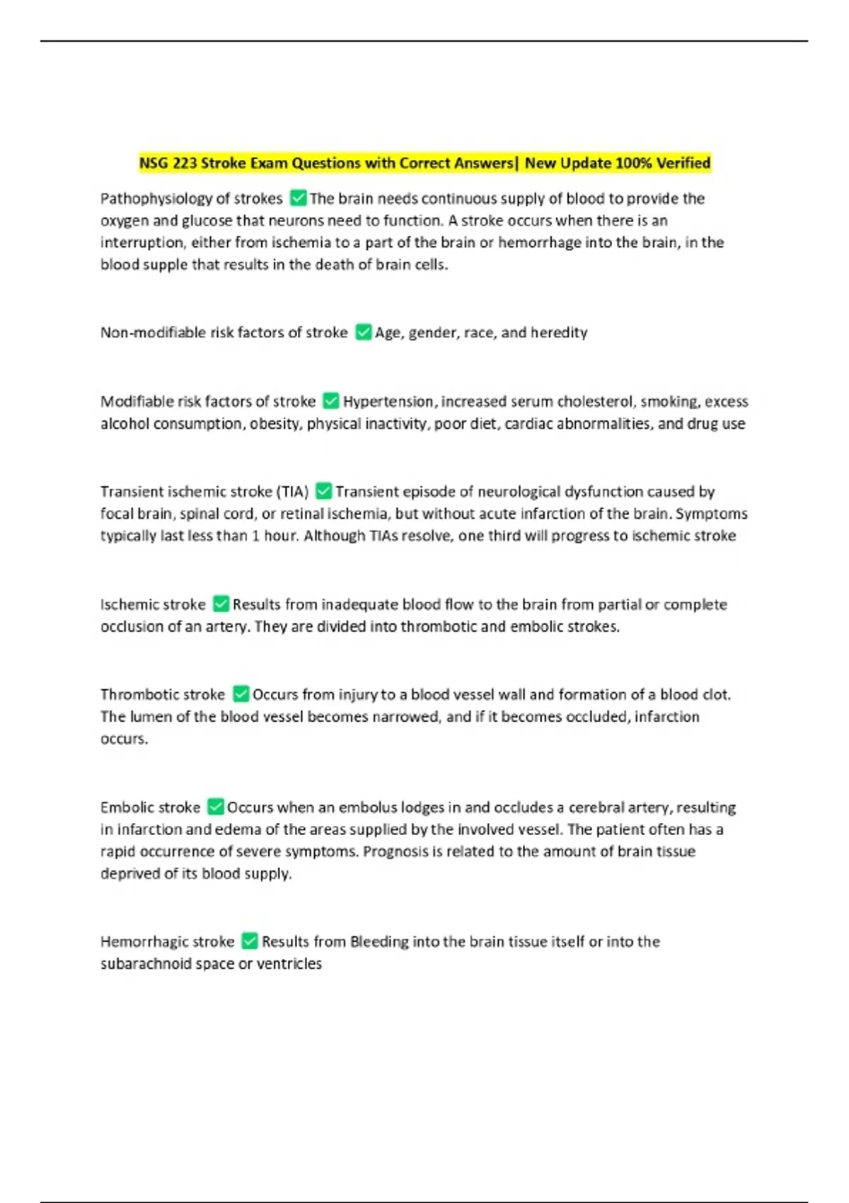 NSG 223 Stroke Exam Questions with Correct Answers| New Update 100% Verified