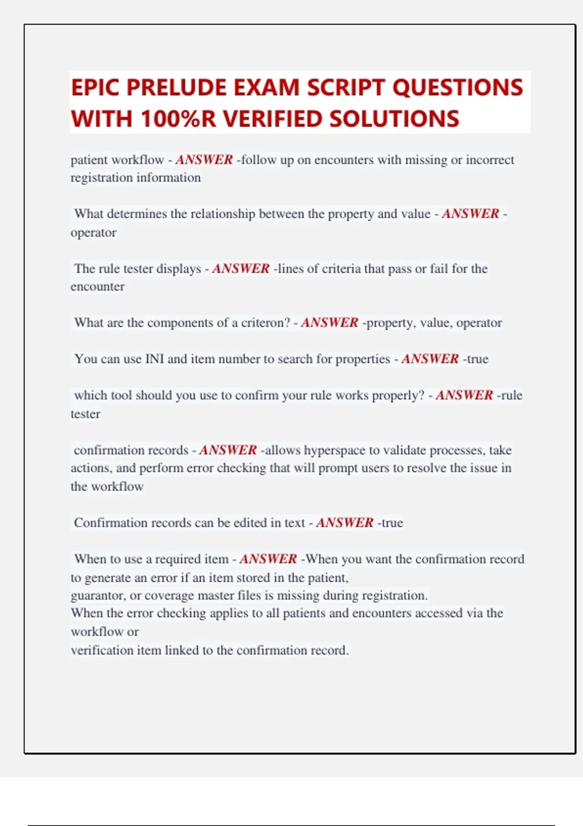EPIC PRELUDE EXAM SCRIPT QUESTIONS WITH 100%R VERIFIED SOLUTIONS patient workflow - ANSWER -follow up on encounters with missing or incorrect registration information What determines the relationship between the property and value - ANSWER operator The rule tester displays - ANSWER -lines of criteria that pass or fail for the encounter What are the components of a criteron? - ANSWER -property, value, operator You can use INI and item number to search for properties - ANSWER -true which tool should you use to confirm your rule works properly? - ANSWER -rule tester confirmation records - ANSWER -allows hyperspace to validate processes, take actions, and perform error checking that will prompt users to resolve the issue in the workflow Confirmation records can be edited in text - ANSWER -true When to use a required item - ANSWER -When you want the confirmation record to generate an error if an item stored in the patient, guarantor, or coverage master files is missing during registration. When the error checking applies to all patients and encounters accessed via the workflow or verification item linked to the confirmation record. When to use a rule specification - ANSWER -To display a warning or to create an error message for a missing item that is not stored in the patient, guarantor, or coverage master files. To also create an error message for a missing item that is stored in the patient, guarantor, or coverage master files, but you want that error to apply to a certain group of patients. To also perform complex error checking beyond a missing item, such as checking for specific values in one or more fields. Use for any single items in EPT, EAR, CVG and that should be an error - ANSWER -required item What is the appropriate step after you bulid? - ANSWER -link Verification statueses - ANSWER -appear to a user when they click the "show more information" icon for a record in the checklist two most important statuses of verification - ANSWER -verified, and elapsed By default the five statuses that might appear for verification - ANSWER verified, elapsed, update, new or error Elapsed - ANSWER -After the verification duration for a patient or coverage has expired, the status automatically displayed is Elapsed. Verification confirmation records indicate what? - ANSWER -what is necessary to update the verification status not what is needed to continue the workflow Where can you link a confirmation record in order to generate error or warning messages for verification? - ANSWER -revenue location and service area Workflow confirmation records - ANSWER -perform error checking when the user selects one of the action buttons in the bottom right-hand corner of registration. Two different places to link confirmation records - ANSWER -action confirmation record and finish confirmation record Action confirmation record - ANSWER -field is used when the user attempts to complete the workflow ﴾for example, when they click Sign In, Check In, Preadmit, Admit, or Discharge﴿. Finish confirmation record - ANSWER -used when the user clicks cancel, pending or finish