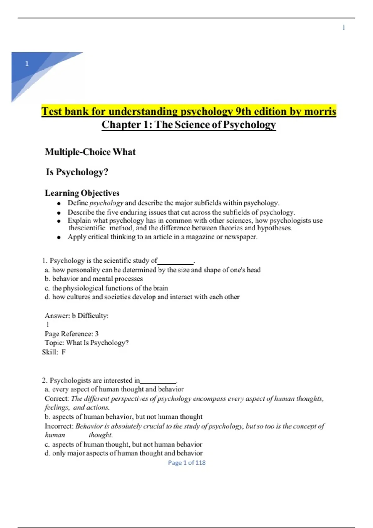 TEST BANK for UNDERSTANDING PSYCHOLOGY 9TH EDITION BY MORRISTEST BANK for UNDERSTANDING PSYCHOLOGY 9TH EDITION BY MORRIS UNDERSTANDING PSYCHOLOGY 9TH EDITION BY MORRIS TEST BANK Chapter 1: The Science of Psychology Multiple-Choice What Is Psychology? Learning Objectives ● Define psychology and describe the major subfields within psychology. ● Describe the five enduring issues that cut across the subfields of psychology. ● Explain what psychology has in common with other sciences, how psychologists use the scientific method, and the difference between theories and hypotheses. ● Apply critical thinking to an article in a magazine or newspaper. 1. Psychology is the scientific study of . a. how personality can be determined by the size and shape of one's head b. behavior and mental processes c. the physiological functions of the brain d. how cultures and societies develop and interact with each other Answer: b Difficulty: 1 Page Reference: 3 Topic: What Is Psychology? Skill: F 2. Psychologists are interested in . a. every aspect of human thought and behavior Correct: The different perspectives of psychology encompass every aspect of human thoughts, feelings, and actions. b. aspects of human behavior, but not human thought Incorrect: Behavior is absolutely crucial to the study of psychology, but so too is the concept of human thought. c. aspects of human thought, but not human behavior d. only major aspects of human thought and behavior Answer: a Difficulty: 1 Page Reference: 3 Topic: What Is Psychology? Skill: C 3. Psychology . a. rarely redefines itself, and when it does, it does so more narrowly b. virtually never redefines itself Incorrect: The field of psychology is very introspective, making sure to redefine itself as often as is necessary. c. continually redefines itself more narrowly d. continually redefines itself more broadly Correct: New research methods, areas of inquiry, and collaborations with other sciences allows psychology to continually redefine itself. Answer: d Difficulty: 2 Page Reference: 3 Topic: What Is Psychology? Skill: F 4. Psychology is . a. is a single, unified field of study Incorrect: There is no single, unifying definition of psychology; rather, it is a combination of many different areas of academic pursuit. b. is an "umbrella" for a loose amalgamation of different subfields Correct: The fact that there is no single unifying definition of psychology suggests that it is a combination of many sub-disciplines. c. is comprised of two distinct subfields d. not a field of study at all Answer: b Difficulty: 1 Page Reference: 3 Topic: What Is Psychology? Skill: C 5. Each of the following is a specialty area within developmental psychology EXCEPT . a. lifespan psychology b. psychobiology c. child psychology d. adolescent psychology Answer: b Difficulty: 1 Page Reference: 4 Topic: What Is Psychology? Skill: F 6. If I ran a TV station and wanted a consultant to advise me on children's programming, I would most likely hire a(n) psychologist. a. experimental b. developmental Correct: A developmental psychologist would be an expert in the cognitive development of children, so would have good information on how to structure children’s television programming. c. personality d. clinical Incorrect: A clinical psychologist might, indeed, work with children with various levels of psychopathology, but the best answer here is an expert on children’s development, or a developmental psychologist. Answer: b Difficulty: 1 4 yr.: 90% r = .31 Page Reference: 4 Topic: What Is Psychology? Skill: A 7. Life-span psychologists focus mainly on studying . a. adolescent changes and development b. the adult years c. the entire developmental spectrum from infancy through adulthood d. infancy and childhood development Answer: b Difficulty: 2 Page Reference: 4 Topic: What Is Psychology? Skill: F 8. The American Psychological Association is made up of about divisions. a. 10 b. 30 c. 70 d. 50 Answer: d Difficulty: 2 Page Reference: 4 Topic: What Is Psychology? Skill: F 9. A group of psychologists study human, mental, and physical growth from the prenatal period through childhood, adolescence, adulthood, and old age. They are most likely psychologists. a. developmental Correct: Developmental psychologists study all aspects of growth and change from conception through death. b. social Incorrect: Social psychologists study the bidirectional effects that people have on each other, including thoughts, feelings, and actions. c. personality d. organizational Answer: a Difficulty: 1 Page Reference: 4 Topic: What Is Psychology? Skill: A 10. Child psychology, adolescent psychology, and lifespan psychology are specialty areas within the field of psychology known as psychology. a. health b. physiological c. personality d. developmental Answer: d Difficulty: 1 Page Reference: 4 Topic: What Is Psychology? Skill: F 11. investigate the impact of heredity on both normal and abnormal traits and behavior. a. Behavioral geneticists Correct: Behavioral geneticists focus on how genetics influence the traits and behaviors we develop throughout life. b. Experimental psychologists c. Neuropsychologists d. Psychobiologists Incorrect: A behavioral geneticist is a type of psychobiologist, but the best answer is a behavioral geneticist. Answer: a Difficulty: 2 Page Reference: 5 Topic: What Is Psychology? Skill: C 12. are interested in the workings of the brain and the nervous system. a. Experimental psychologists b. Psychobiologists Incorrect: A neuropsychologist is a type of psychobiologist, but the best answer is a neuropsychologist. c. Behavioral geneticists d. Neuropsychologists Correct: Neuropsychologists focus on the functions of the brain, including electrical and chemical processes, as well as the rest of the nervous system. Answer: d Difficulty: 1 Page Reference: 5 Topic: What Is Psychology? Skill: C 13. A group of psychologists are interested in how the brain enables us to perceive the world through our sens