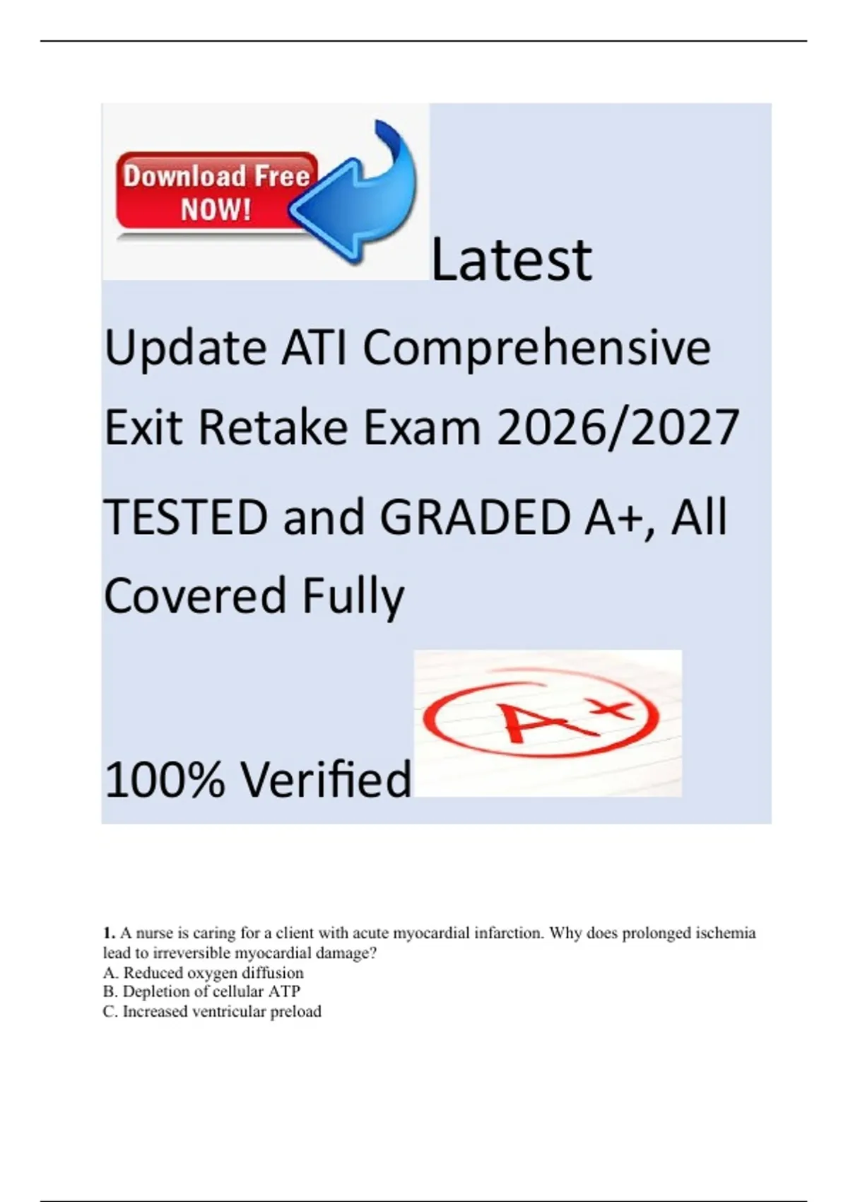 our meticulously crafted ATI Comprehensive Exit Exam Retake package, specifically designed for the 2026/2027 academic year. This thorough study resource has been rigorously tested and graded with an impressive A+, ensuring that you receive the most effective and comprehensive preparation for your exam. **Key Features:** - **Fully Covered Content:** Our package covers all the necessary topics and subjects that you need to master for the ATI Comprehensive Exit Exam, providing you with a comprehensive understanding of the material. - **Tested and Graded A+:** The quality and effectiveness of our study package have been verified through rigorous testing and grading, guaranteeing an A+ standard of preparation. - **2026/2027 Update:** Stay up-to-date with the latest curriculum and exam format for the 2026/2027 academic year, ensuring that you are fully prepared for any changes or updates to the exam. **Benefits:** - **Enhanced Knowledge:** Gain a deeper understanding of the subject matter, thanks to our detailed and well-structured study resources. - **Confidence Boost:** Feel more confident and prepared for your exam, knowing that you have covered all the necessary material and have been equipped with the knowledge and skills to succeed. - **Improved Performance:** Our comprehensive study package is designed to help you achieve the best possible results on your ATI Comprehensive Exit Exam retake, paving the way for a successful nursing career. **Invest in Your Success:** Don't miss this opportunity to excel in your nursing education. Our ATI Comprehensive Exit Exam Retake package 2026/2027 is the ultimate study resource to help you achieve your academic goals. With its comprehensive coverage, A+ graded content, and up-to-date material, you'll be well on your way to passing your exam with flying colors.
