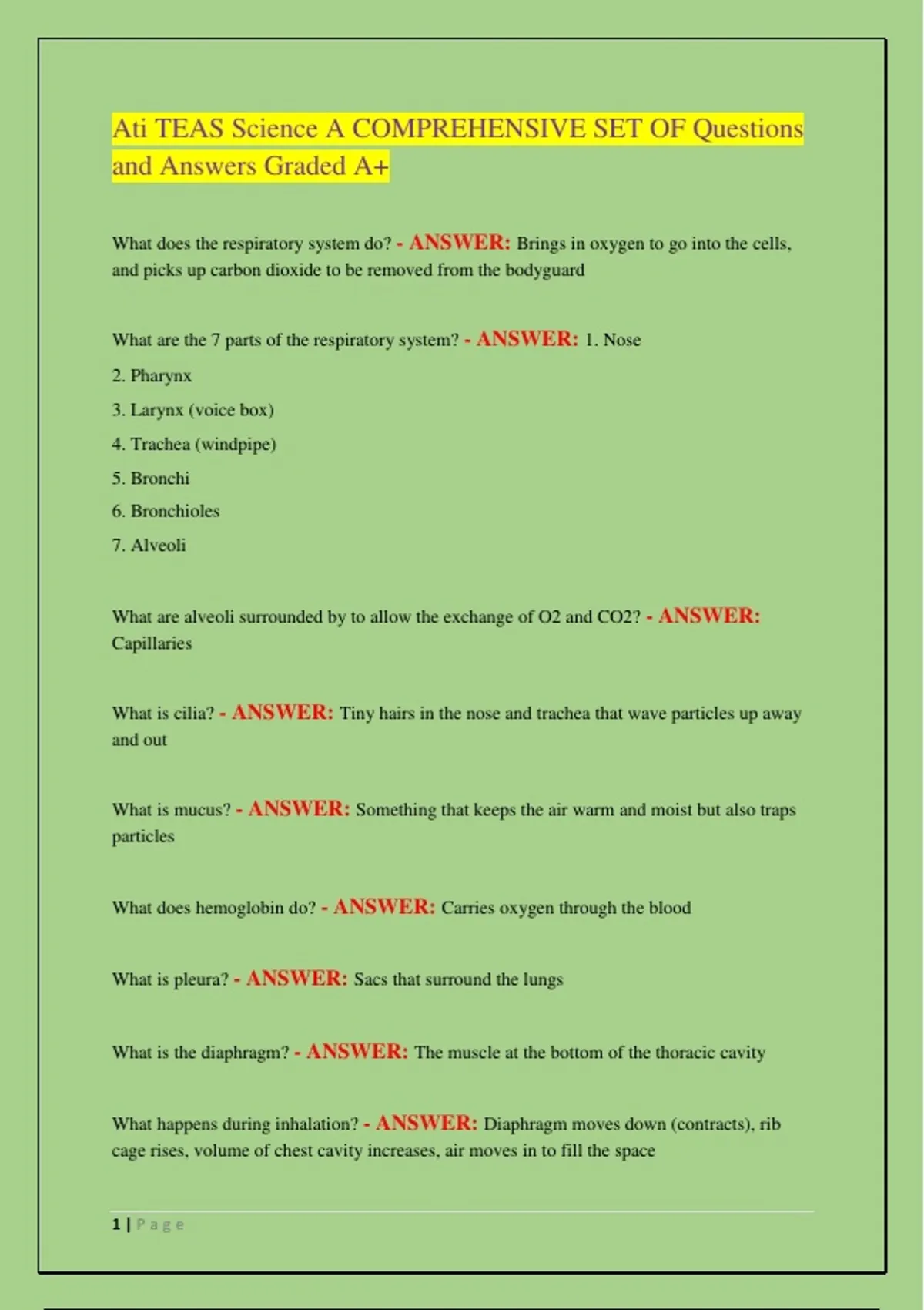 What are the 7 parts of the respiratory system? - ANSWER: 1. Nose