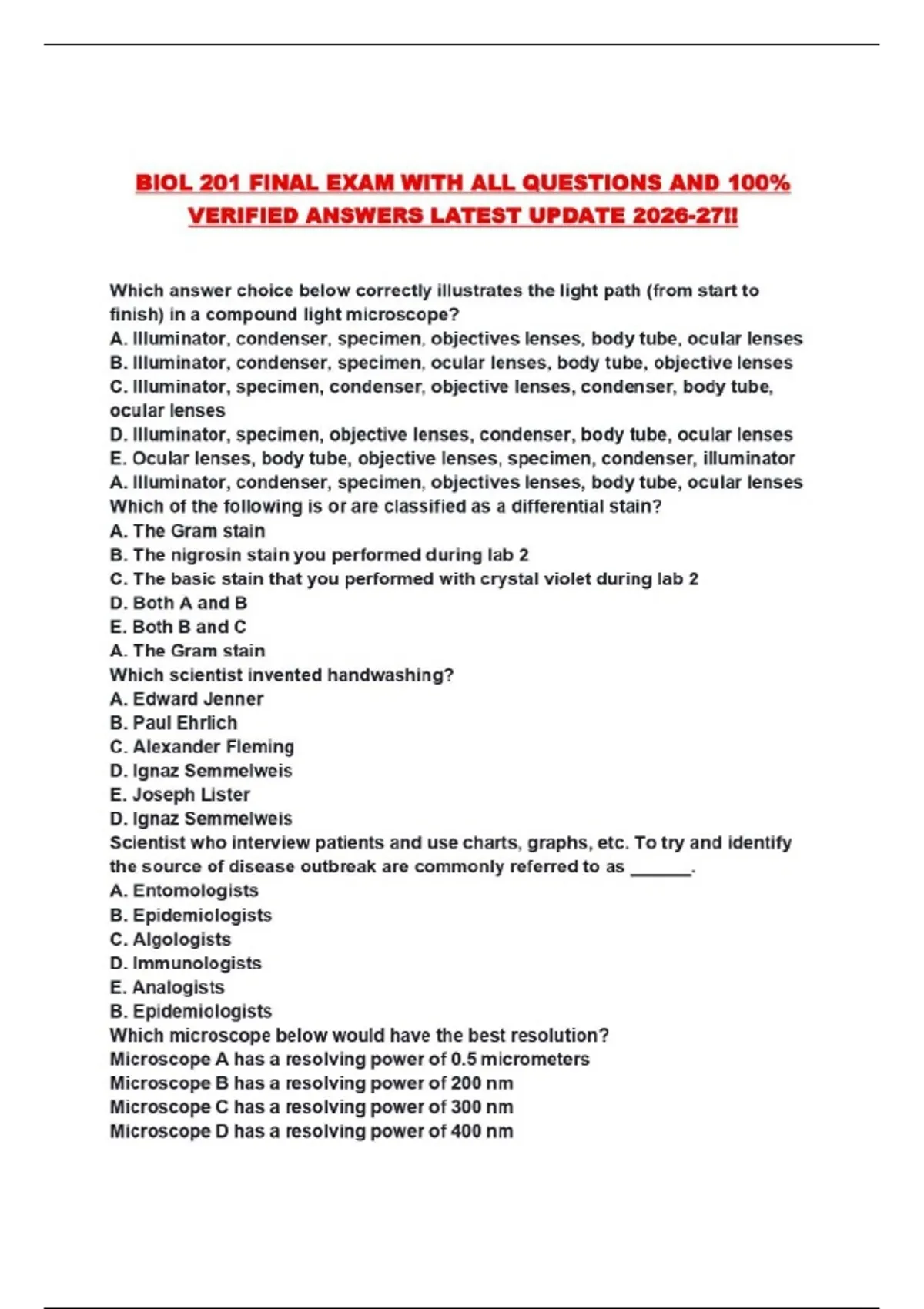 BIOL 201 FINAL EXAM WITH ALL QUESTIONS AND 100% VERIFIED ANSWERS LATEST UPDATE 2026-27!!...