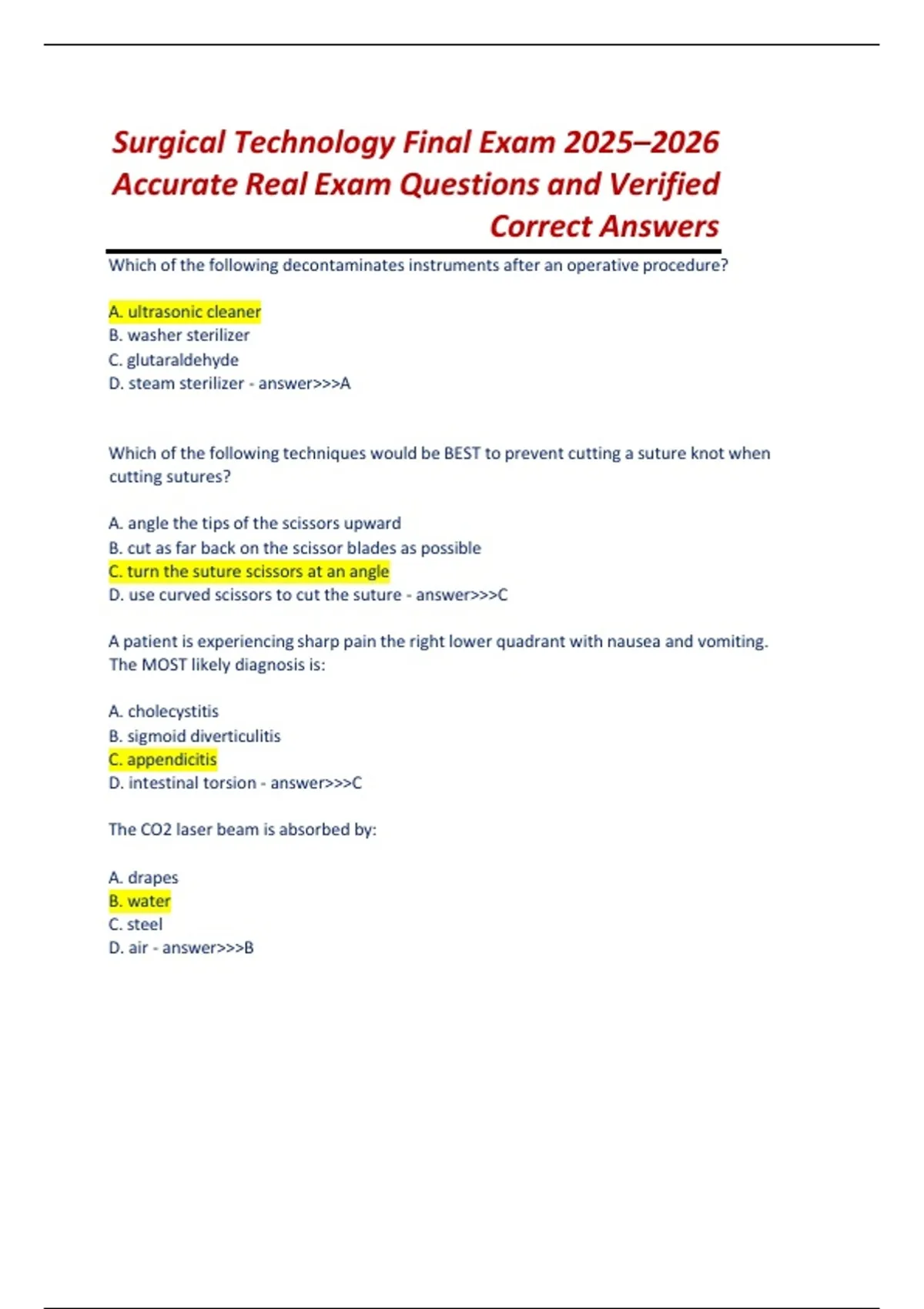Prepare for the Surgical Technology Final Exam 2025–2026 with accurate real exam questions and verified correct answers. This comprehensive surgical technology exam prep resource supports surgical technologist students in mastering aseptic technique, surgical procedures, instrumentation, patient safety, and perioperative concepts for confident exam performance.