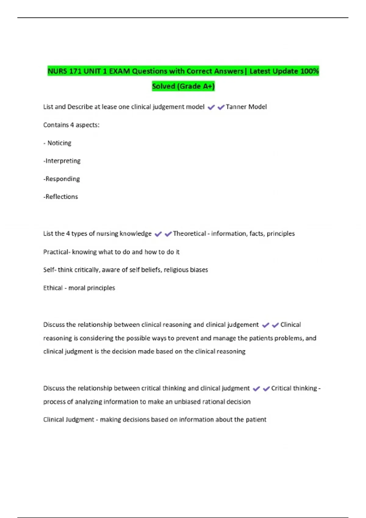 NURS 171 UNIT 1 EXAM Questions with Correct Answers| Latest Update 100% Solved (Grade A+)